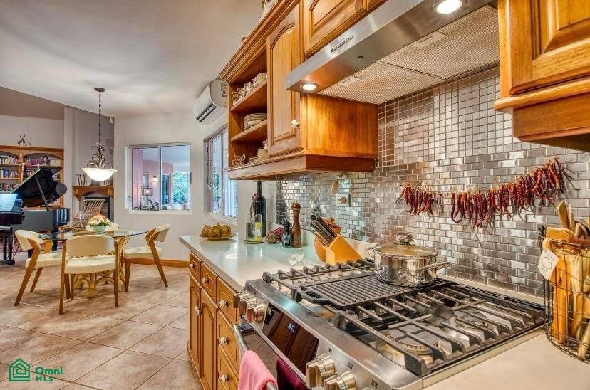 The living area opens into the U-shaped eat-in kitchen, with a large island, an abundance of cabinetry and granite work surfaces, a walk-in pantry, and a small office space. This kitchen is so well-equipped that it would make any gourmand green with envy.