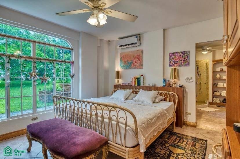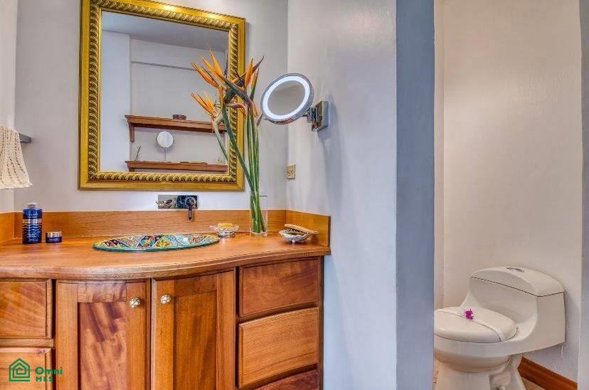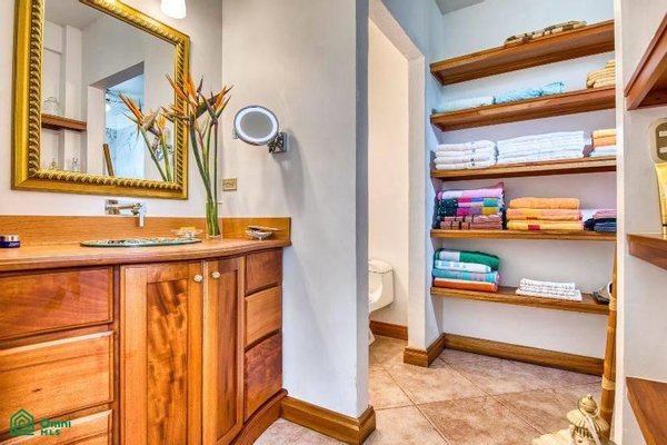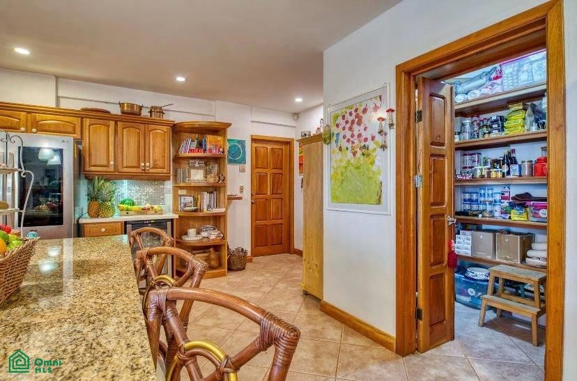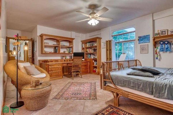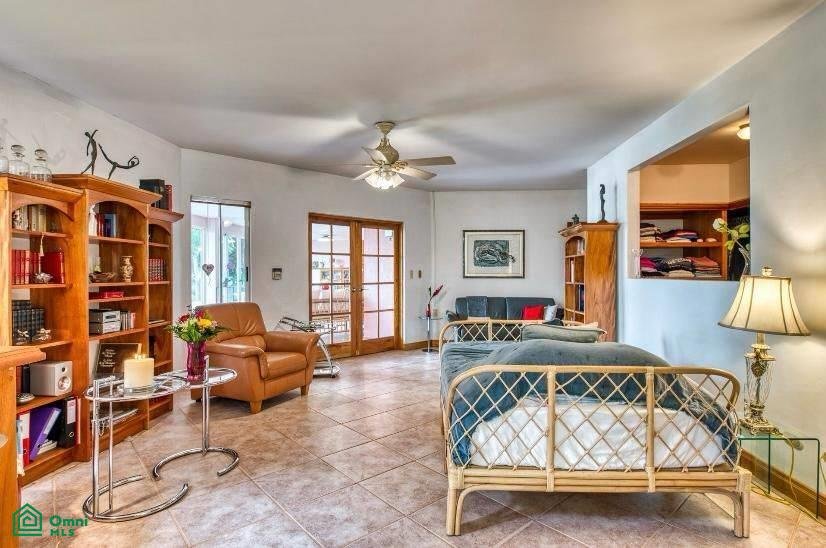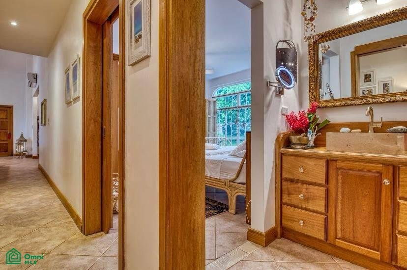 There are two oversize guest bedrooms, one with a walk-in closet and a custom-built desk. The other bedroom features beautiful tropical wood built-in closets.