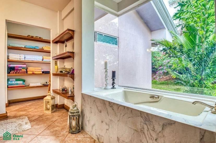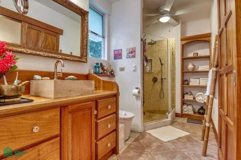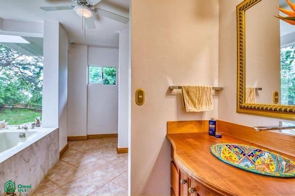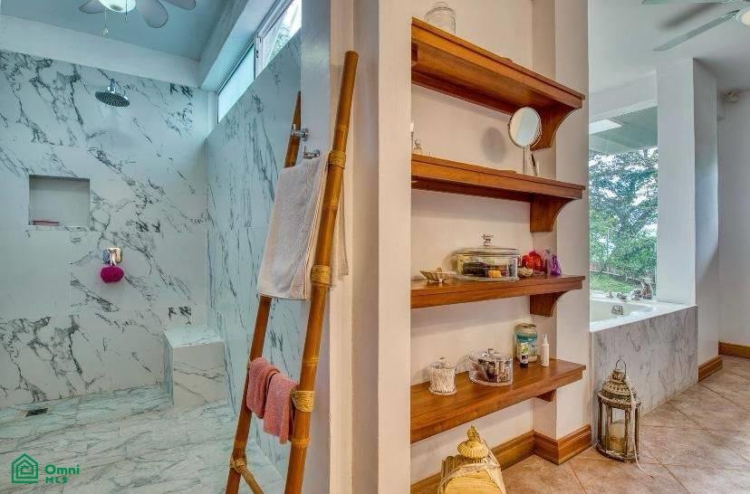 The master suite is pure luxury with a large walk-in closet and an en-suite bathroom that features a walk-in shower and a luxurious soaking tub that’s surrounded by glass, bringing the exotic Costa Rican landscape indoors.