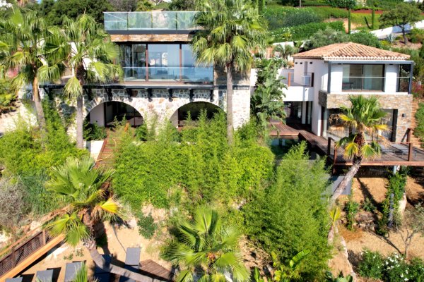 ZUM VERKAUF in SAINTE-MAXIME, innerhalb eines Privatanwesens, einer Immobilie mit zwei zeitgenössischen Villen: Auf einem sonnenverwöhnten Grundstück gelegen, besteht diese zeitgenössische Immobilie aus zwei Villen mit atemberaubendem Blick auf das
