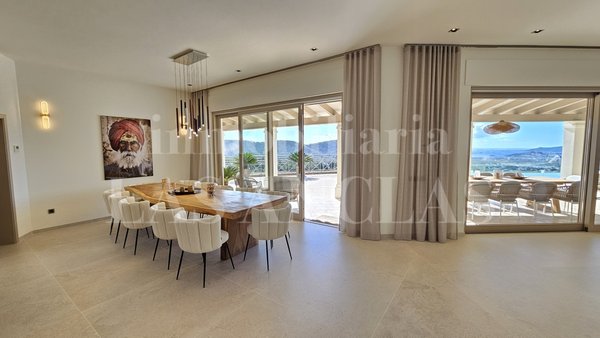 Auf der weitläufigen, teilweise überdachten Terrasse mit Travertin-Marmorboden, laden mehrere komfortable Sitzbereiche und ein großzügiger Esstisch für zehn Personen dazu ein, den 12 x 5 Meter messenden Infinity-Pool mit seiner atemberaubenden Aussicht zu genießen.