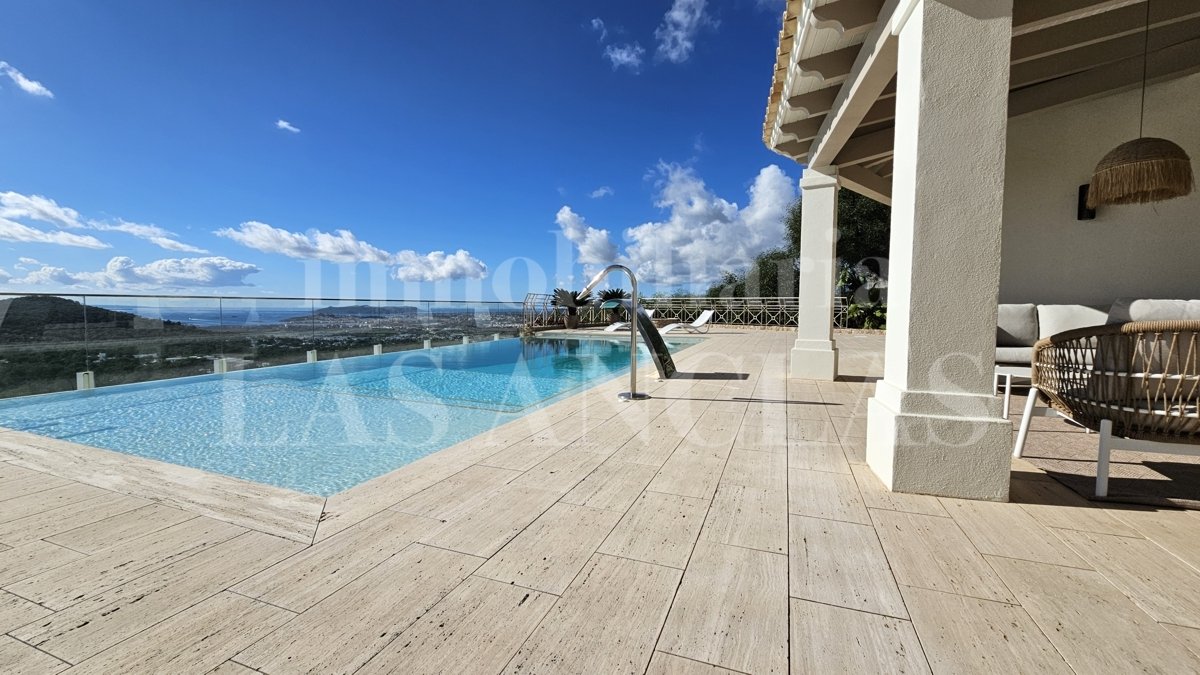 Auf der weitläufigen, teilweise überdachten Terrasse mit Travertin-Marmorboden, laden mehrere komfortable Sitzbereiche und ein großzügiger Esstisch für zehn Personen dazu ein, den 12 x 5 Meter messenden Infinity-Pool mit seiner atemberaubenden Aussicht zu genießen.