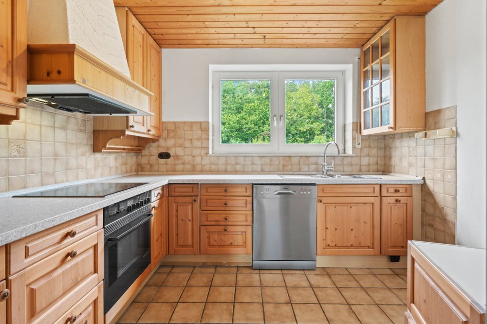 Die Küche mit Elektrogeräten im Holzdesign sowie ein Duschbad befinden sich auch auf dieser Etage der attraktiven Wohnung.
