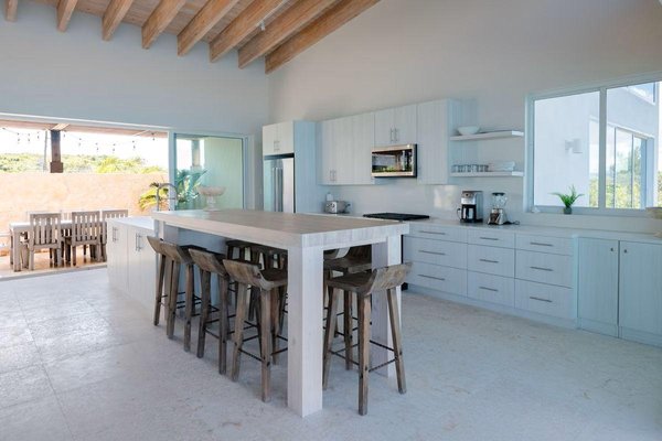 Vom Moment an, in dem man hineintritt, steht der Ozean im Mittelpunkt. Ein offenes Wohnzimmer vereint nahtlos Wohn-, Ess- und Küchenbereiche und wird durch 30 Fuß breite Schiebetüren aus Glas verankert, die einen atemberaubenden Blick auf Ozean, Strand und Küste um 180 Grad einrahmen. Organische Texturen, bequeme Einrichtung und saubere, moderne Linien schaffen eine entspannte, aber gehobene Inselatmosphäre, die sowohl zum Unterhalten als auch zum Entspannen nach sonnigen Tagen perfekt ist.