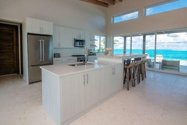 Vom Moment an, in dem man hineintritt, steht der Ozean im Mittelpunkt. Ein offenes Wohnzimmer vereint nahtlos Wohn-, Ess- und Küchenbereiche und wird durch 30 Fuß breite Schiebetüren aus Glas verankert, die einen atemberaubenden Blick auf Ozean, Strand und Küste um 180 Grad einrahmen. Organische Texturen, bequeme Einrichtung und saubere, moderne Linien schaffen eine entspannte, aber gehobene Inselatmosphäre, die sowohl zum Unterhalten als auch zum Entspannen nach sonnigen Tagen perfekt ist.
