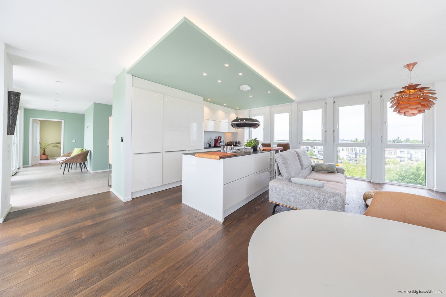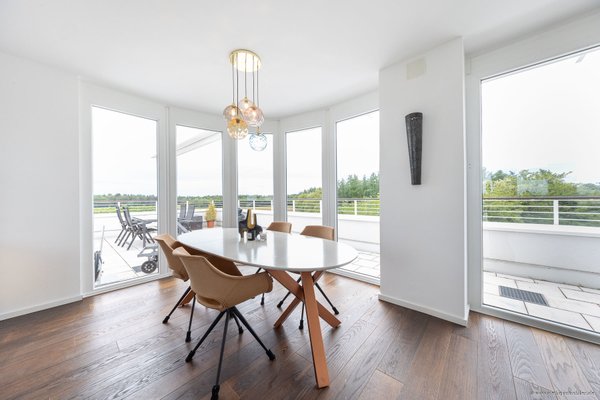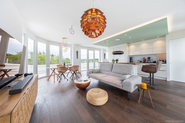 Der offene Wohn- & Essbereich schafft viel Raum für individuelle Gestaltungsideen. Ein architektonisches Highlight ist der abgerundete Glaserker, der den Essplatz mit Tageslicht durchflutet und den Blick auf die angrenzende Dachterrasse sowie die umliegenden Baumwipfel freigibt.