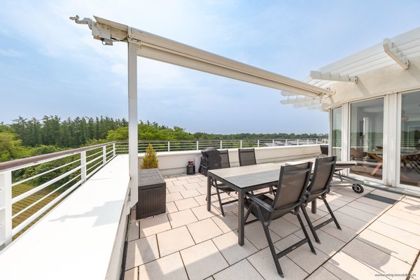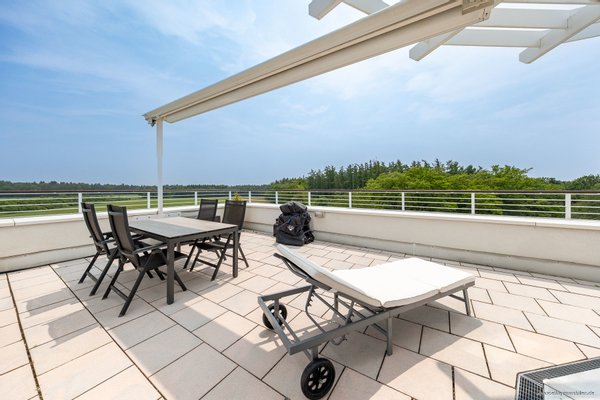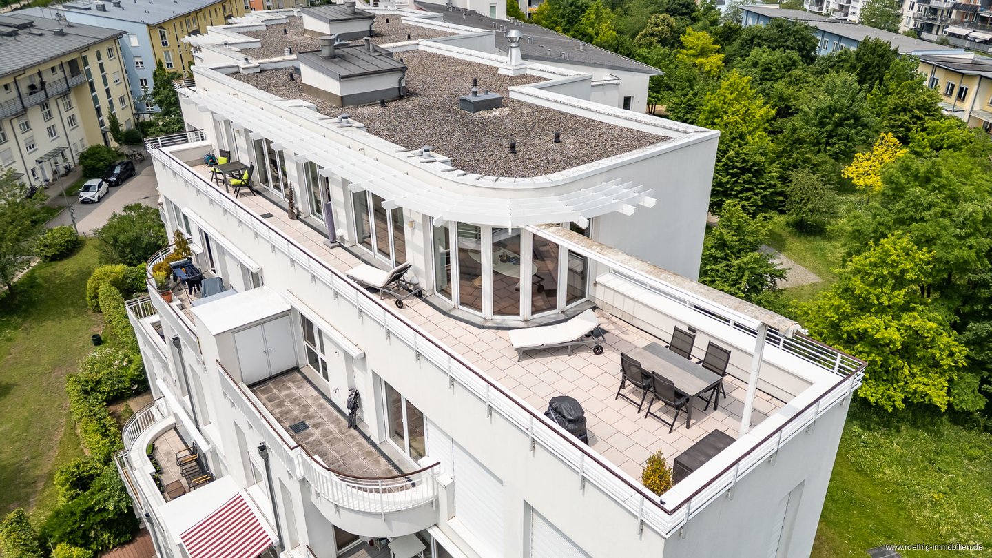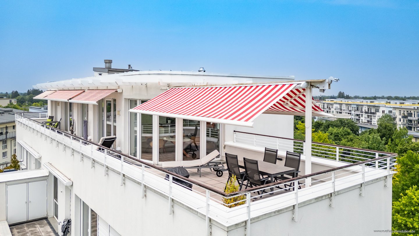 Über die zahlreichen, großen Schiebetüren entlang der Süd/Westseite der Wohnung ist die ca. 55 m² große Dachterrasse mit Strom- & Wasseranschluss von nahezu allen Bereichen aus zugänglich. Abgewandt von den Nachbarhäusern genießen Sie hier – hoch über der Stadt im 5. Obergeschoss – absolute Ruhe und einen unverbauten Blick ins Grüne. Die Ausrichtung nach Osten, Süden bzw. Westen macht diesen außergewöhnlichen Außenbereich zum perfekten Ort für gemeinsame Stunden. Der Hauptbereich ist mit zwei automatischen, elektrischen Markisen versehen und sorgt für einen optimalen Essbereich. Drei weitere Markisen erstrecken sich über die komplette Breite der Dachterrasse und ermöglichen auf Wunsch eine vollflächige Beschattung – ideal für sonnige Tage. Hinweis: Auf der Terrasse ist zudem Starkstrom vorhanden, z.B. für den Anschluss einer Außensauna oder eines Whirlpools.