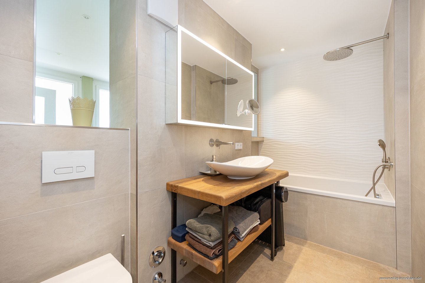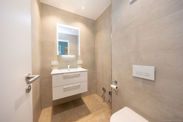 Das Gäste-Bad mit Belüftung wurde in derselben ruhigen, steinfarbenen Optik wie das Hauptbad gestaltet. Ein hochwertiges Waschbecken mit beleuchtetem Spiegel sowie ein WC der Marke „Duravit“ sorgen auch hier für Komfort.