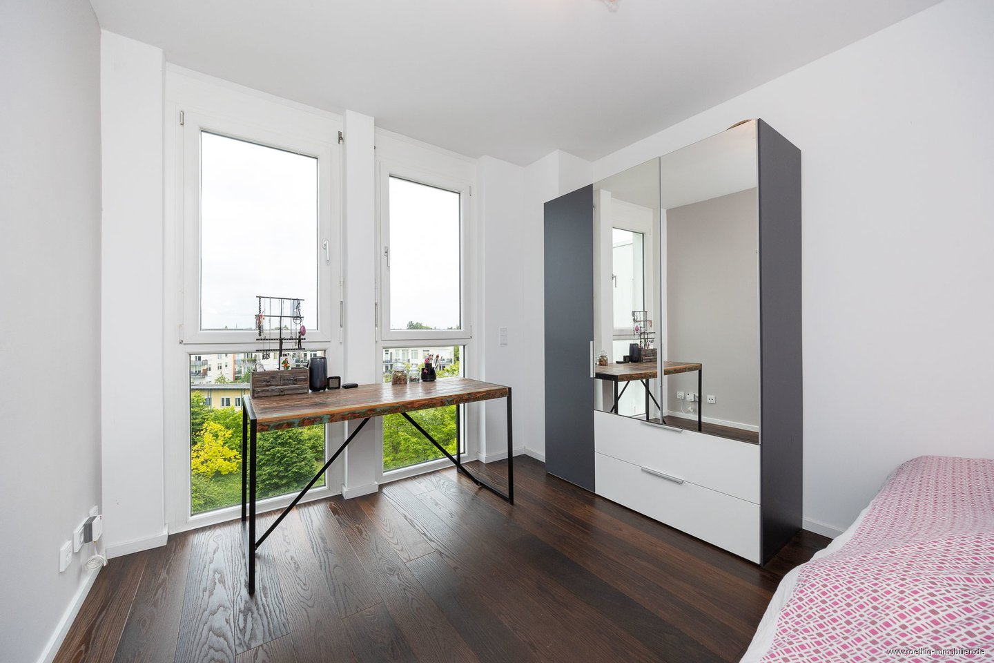 Das angrenzende Kinderzimmer bietet mit zwei großen Doppelfenstern einen weiten Blick ins Grüne sowie vielfältige Möglichkeiten zur individuellen Einrichtung.