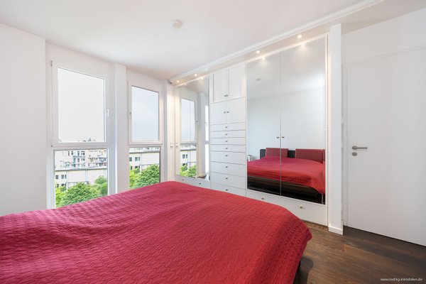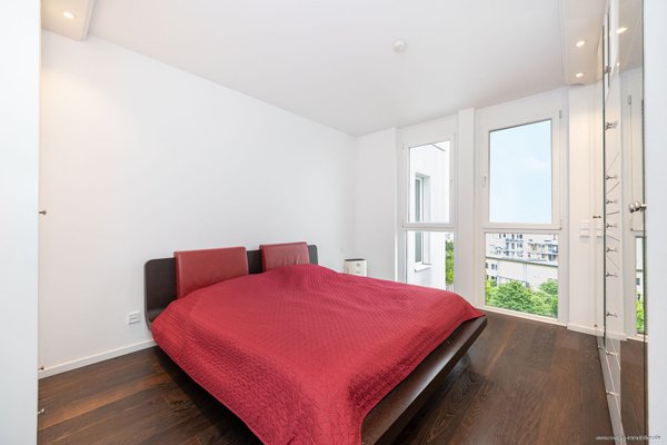 Am Ende des Flures befindet sich auf der linken Seite das Elternschlafzimmer mit einer maßgefertigten, in die Wand integrierten Schreiner-Garderobe mit Beleuchtung. Zwei bodentiefe Fenster lassen tagsüber viel Licht herein, während die Nordost-Ausrichtung in den Abend- und Nachtstunden eine angenehm ruhige Atmosphäre verspricht.