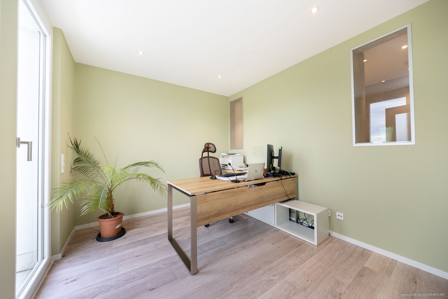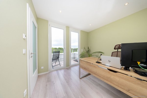 Zurück im Eingangsbereich gelangen Sie über einen zweiten, kleinen Flur mit Sitzgelegenheit – gestaltet wie eine kleine Innenterrasse – in das ruhig gelegene Büro oder mögliche Kinderzimmer. Dieser helle Raum wurde mit einer speziellen Wandfarbe gegen "Elektrosmog" gestrichen und mit einem ökologischen Korklaminat-Boden in gekalkter Eichenoptik gestaltet.