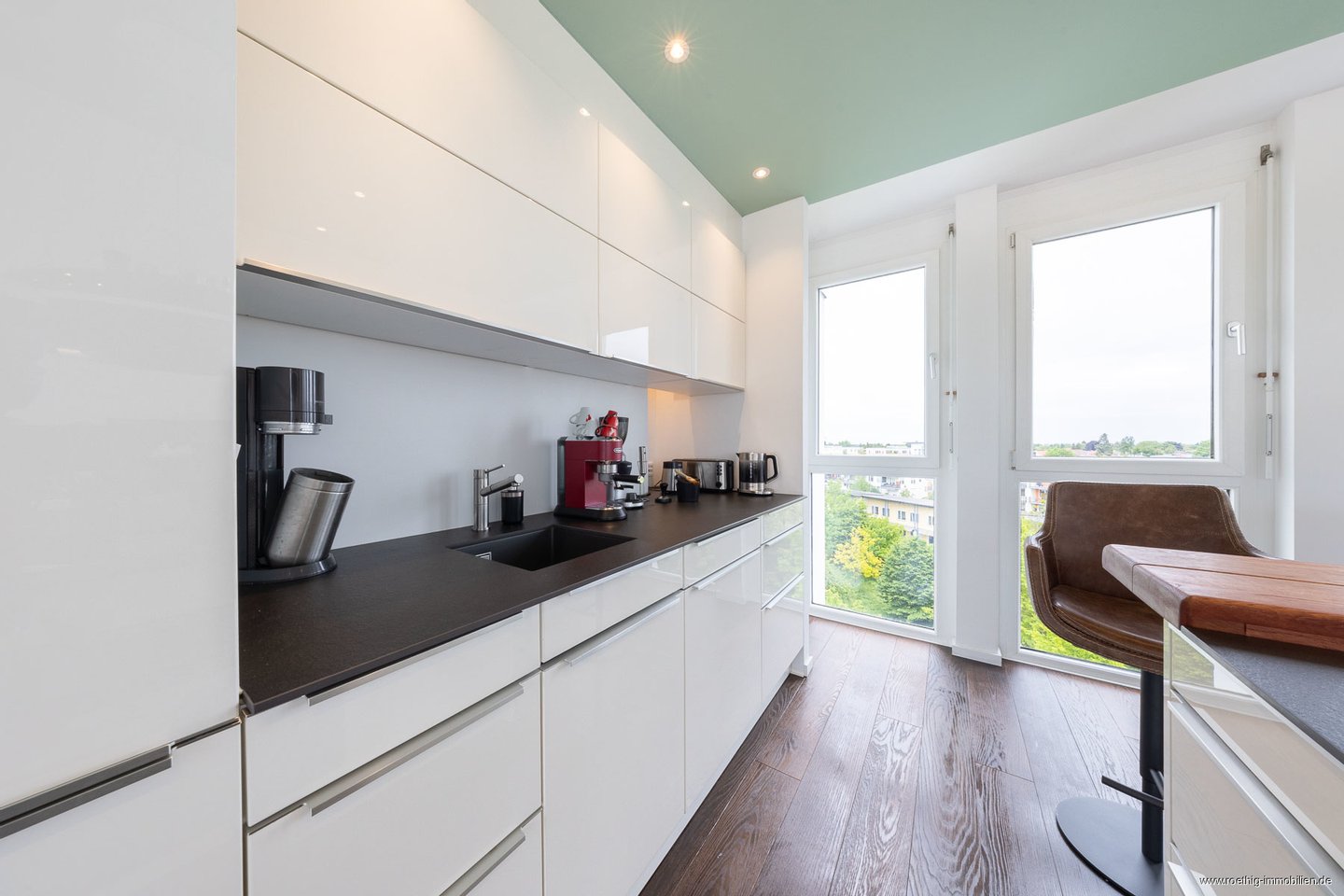 Die moderne Küche besticht durch ausschließlich hochwertige Markengeräte z.B. von Miele und ein elegantes Design in glänzendem Weiß. Eine zentral platzierte Kücheninsel bietet großzügigen Stauraum sowie einen integrierten Backofen, ein Elektrokochfeld mit einem modernen Dunstabzug von Falmec und einen stilvoll eingelassenen Weinkühlschrank. Eine edle Holzplatte hebt sich optisch von der dunklen Neolith-Arbeitsfläche ab und verleiht der Insel eine elegante Bar-Optik. Deckenintegrierte Spots über der Küche und zahlreiche Steckdosen ergänzen das funktionale Gesamtkonzept.