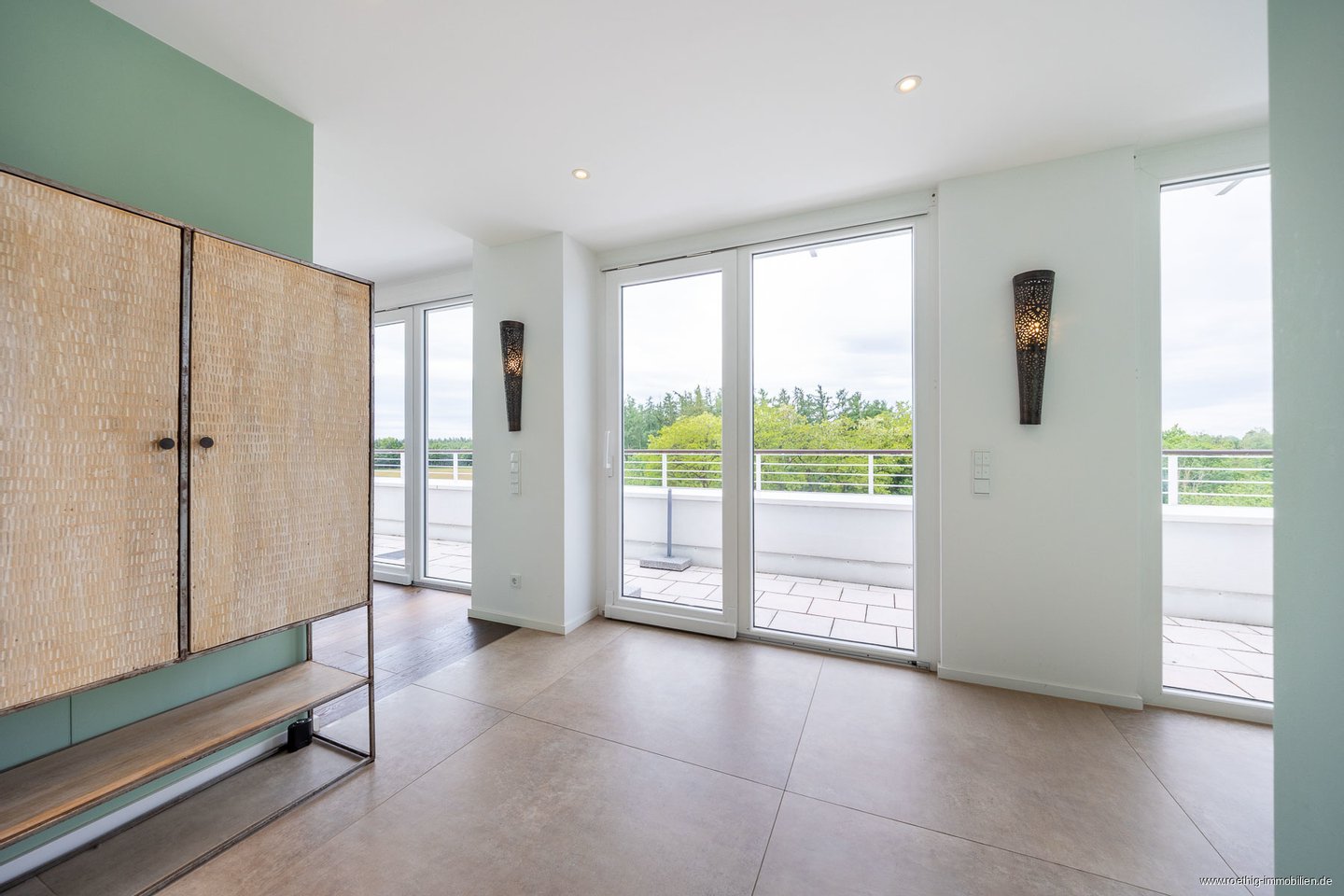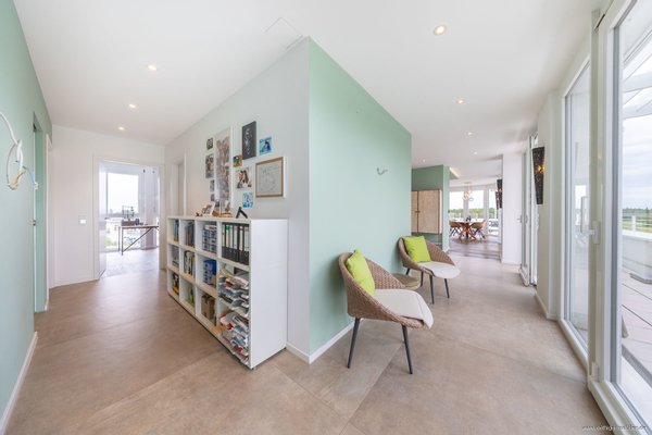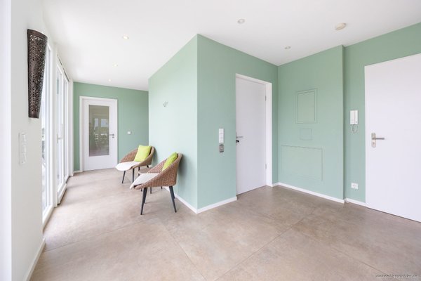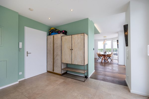 Nach Betreten Ihres neuen Zuhauses erwartet Sie ein repräsentativer Eingangsbereich mit großformatigen Natursteinfliesen und direktem Blick über Ihre wundervolle Dachterrasse auf die pure Naturlandschaft - ein einmaliger Blick bereits beim Nachhausekommen.