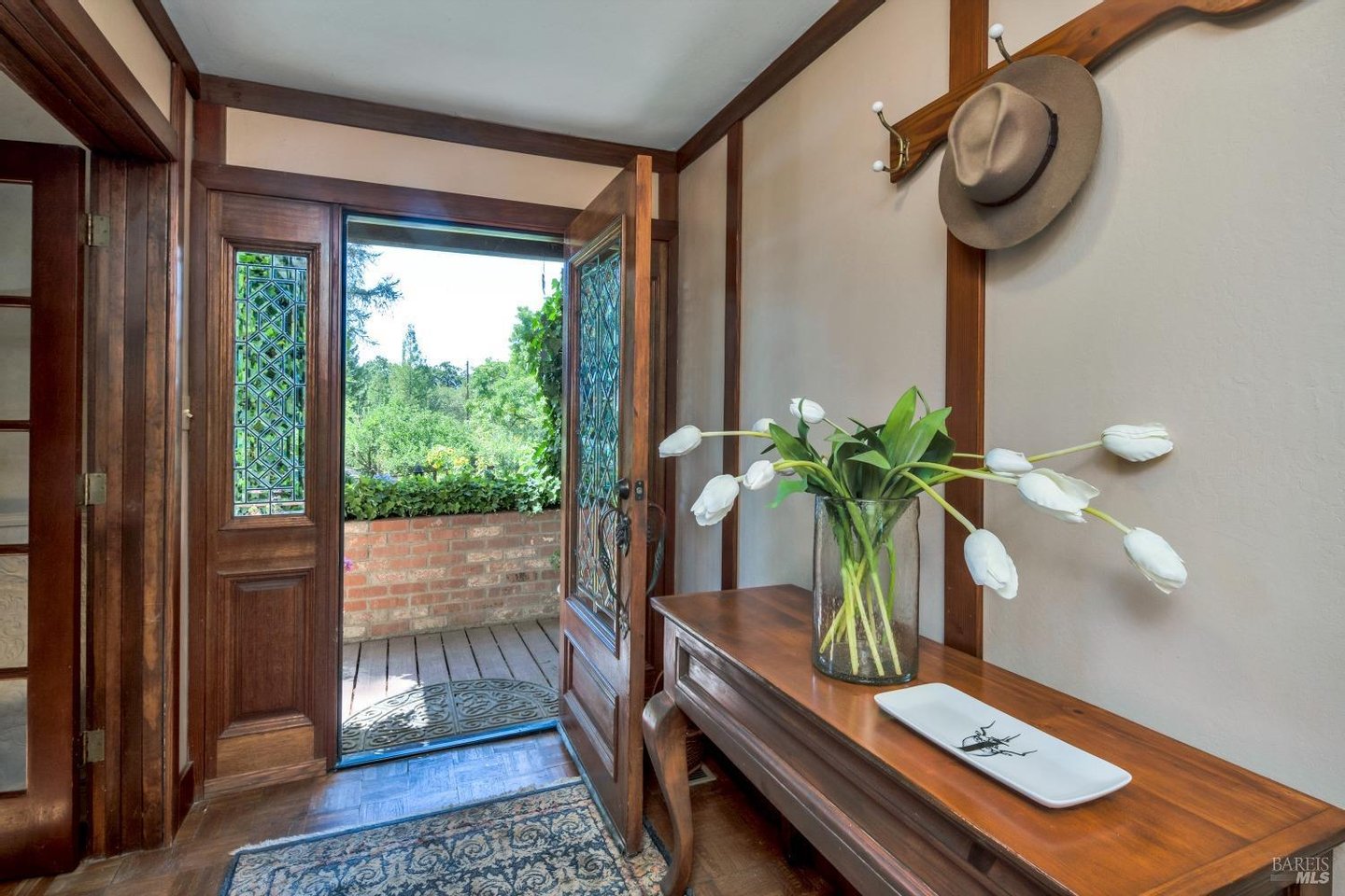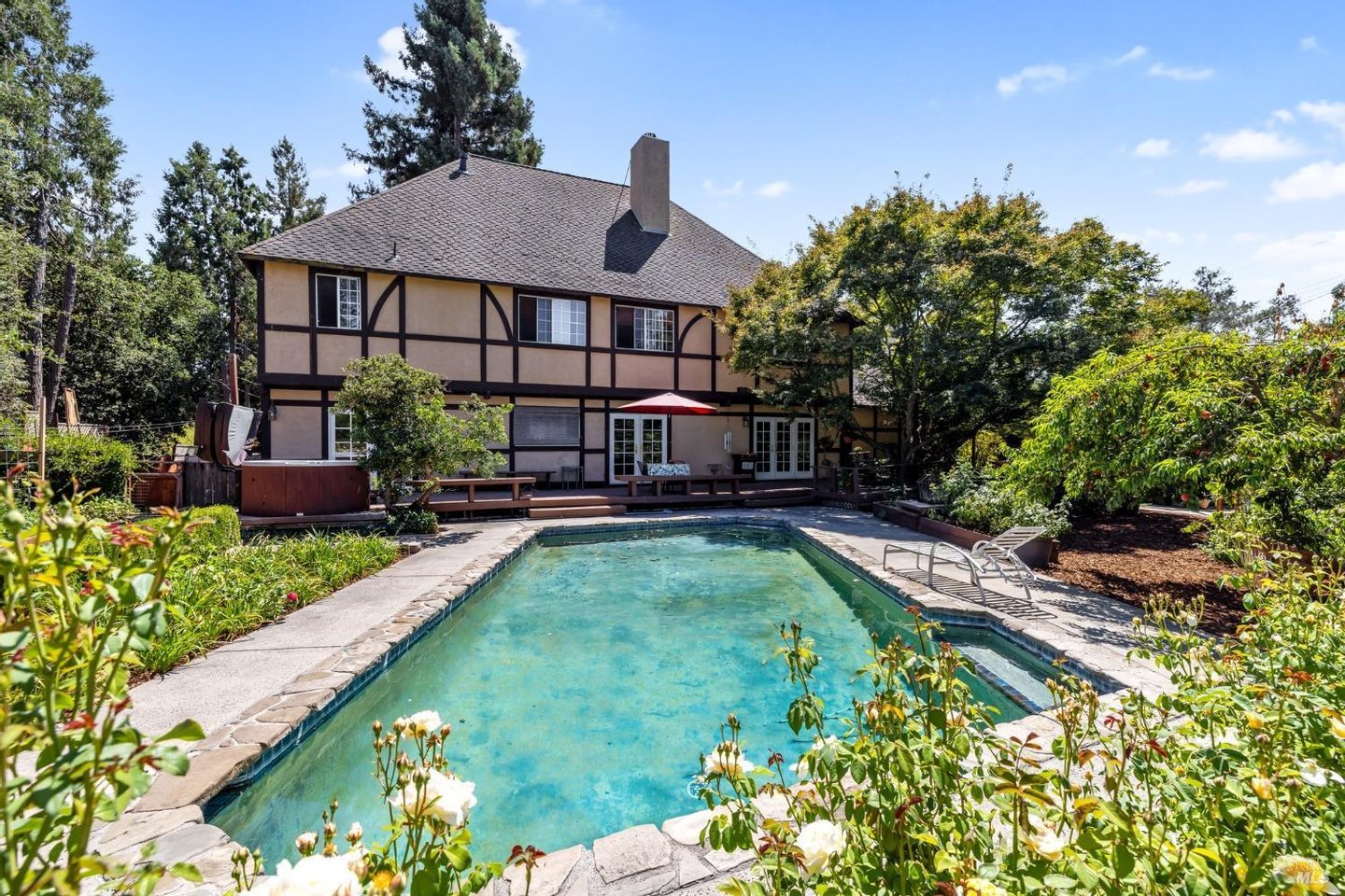 Die perfekte Kombination aus Landleben und Eleganz. Das Haus liegt inmitten von Gärten voller Farben. Genießen Sie die Ruhe, die frische Luft, die Vögel, die im Brunnen spielen. So eine seltene Gelegenheit, einen Hektar reiner Freude zu besitzen. Das Haus wurde im Laufe der Jahre liebevoll gestaltet und modernisiert, wobei die zweite Etage 1992 hinzugefügt wurde. Sie werden die europäischen architektonischen Elemente zu schätzen wissen, von der abgeschrägten Glastür und den importierten Eisenbeschlägen bis hin zu den schönen dekorativen Deckenplatten in der Küche und der Vertäfelung im Treppenhaus. Französische Türen öffnen sich zum hinteren Deck und zum Pool von den Ess-, Familien- und Gästezimmern für den Lebensstil im Innen- und Außenbereich. Das sonnendurchflutete Treppenhaus führt hinauf in das erstaunlichste Familienzimmer mit gewölbter Decke und so viel natürlichem Licht. Es trennt die primäre Suite von einem großen Gästezimmer oder Studio mit viel Stauraum. Fenstertüren und zwei Balkone mit herrlichem Blick auf den Garten. Die riesige Hauptsuite verfügt über eine gewölbte Balkendecke und Gartenblick. Im Vorgarten gibt es so viele Orte, an denen man sich unterhalten oder einfach nur entspannen kann. Obstbäume, Blumen und ein begleitgepflanzter Gemüsegarten, ein Gewächshaus mit Zitrusbäumen und der malerische Seerosenteich. Weitere tolle Ausstattungsmerkmale sind die übergroße Garage mit EV-Ladegerät, Abstellraum und Gartenhaus.