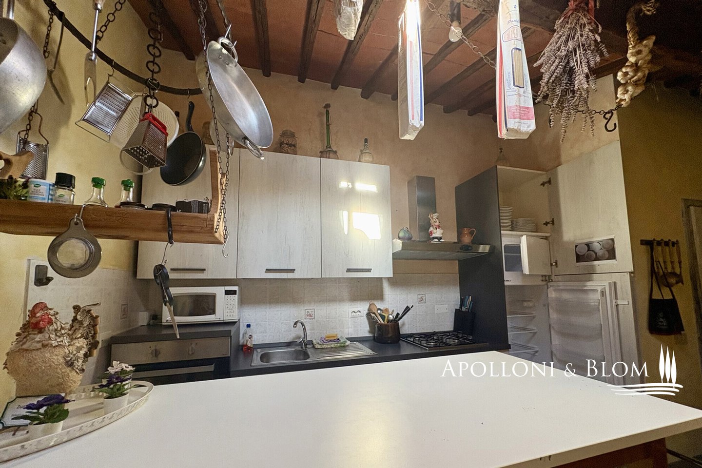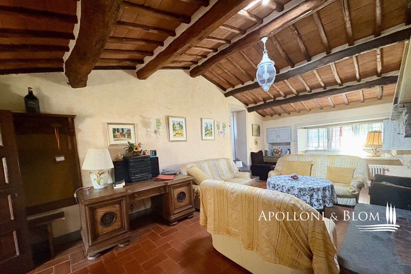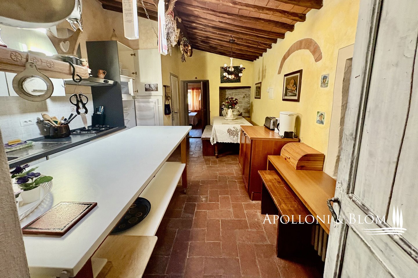 In einem renovierten charmanten Wohnhaus inmitten eines Naturschutzgebietes mit Garten, Panoramaterrasse, Loggia und Schwimmbad. Eingebettet in den Zauber eines Naturschutzgebietes, in dem Stille herrscht, bieten wir eine Wohnung auf zwei Ebenen in einem herrlichen Wohnhaus aus dem Jahr 1400 zum Verkauf an, das den Charme ländlicher Tradition mit einer grundlegenden Restaurierung aus dem Jahr 1998 mit kontinuierlichen Ausbesserungen gekonnt verbindet. Die Immobilie erstreckt sich über eine Innenfläche von 236 Quadratmetern auf zwei Ebenen und zeichnet sich durch edle Materialien wie die originalen Terrakottafliesen, Decken mit freiliegenden Holzbalken sowie Stein- und Ziegelfassaden aus. Im Erdgeschoss befinden sich Funktionsräume (46 Quadratmeter), die als Lager und Technikräume dienen, sowie ein restaurierter antiker Ofen. Im ersten Stock führt der Eingang zu einem eleganten Wohnzimmer mit Kamin, das von einer Hauptküche mit Speisekammer und einem herrlichen Schlafbereich mit vier Schlafzimmern mit eigenem Bad, eines davon mit Whirlpool, flankiert wird. Eine zweite Küche mit direktem Zugang zur 60 m² großen Panoramaterrasse und eine kleine Diele mit Kamin vervollständigen das Innere. Die Harmonie zwischen Innen- und Außenbereich wird durch eine 80 m² große Panoramaterrasse, eine überdachte Loggia und eine 60 m² große Dachterrasse unterstrichen, die sich perfekt für Mahlzeiten im Freien eignet und einen eindrucksvollen Blick auf die umliegende Landschaft bietet. Die Residenz ist von einem etwa einen Hektar großen Garten umgeben, einer Oase der Ruhe, die absolute Privatsphäre garantiert und Zugang zu einem großen Swimmingpool im Grünen bietet. Diese Immobilie ist ein exklusives Angebot für alle, die einen luxuriösen Rückzugsort suchen, der sofort bewohnt werden kann und bei dem jedes architektonische Detail und jede Ausstattung von einem gekonnten Bauhandwerk zeugt.