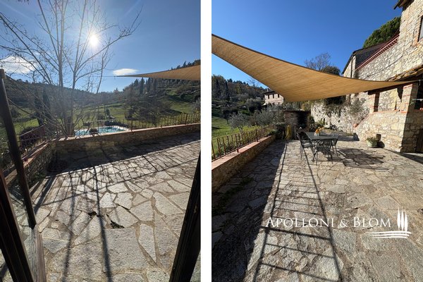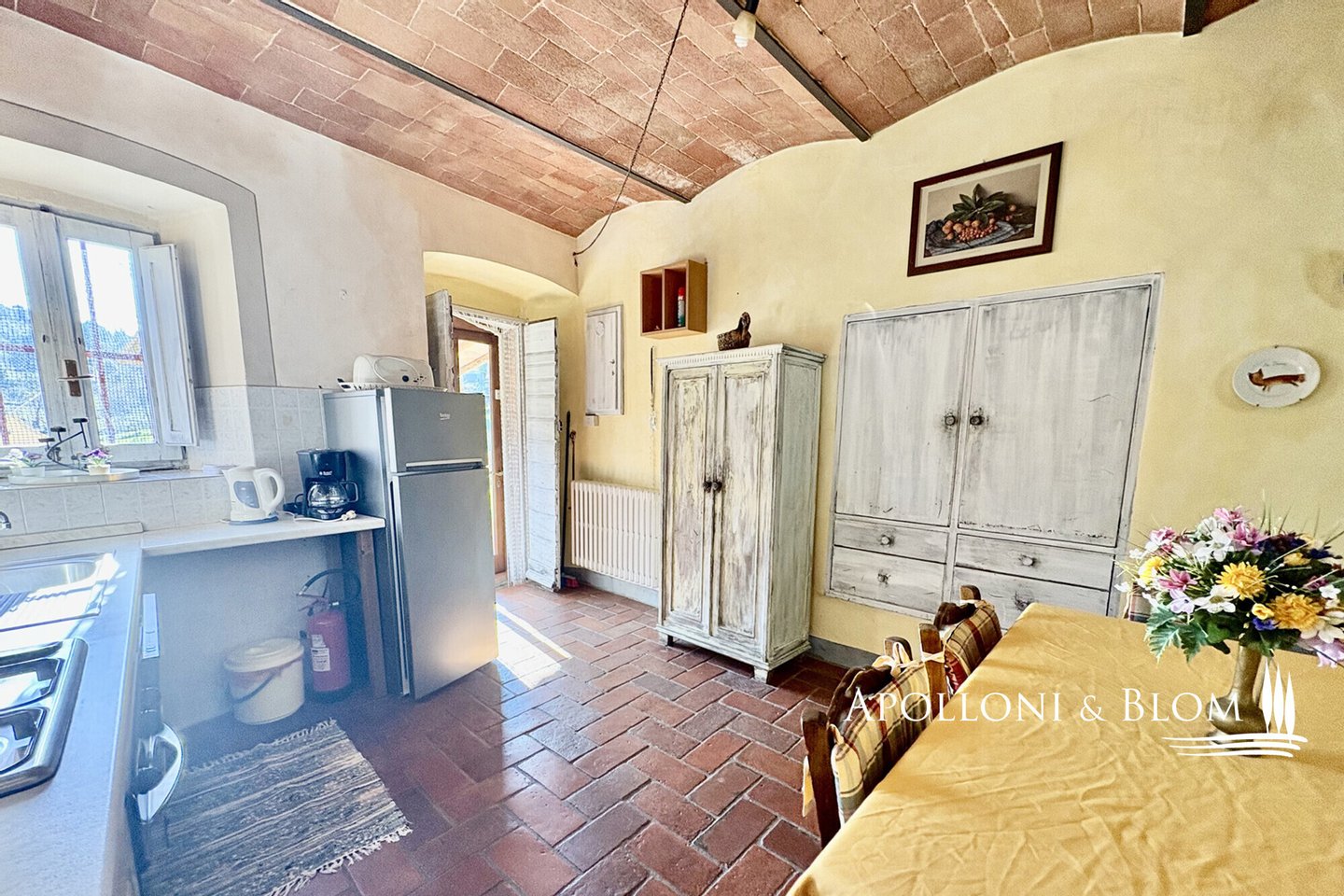 Typisch toskanisches Wohnhaus mit Panoramablick, Innenräumen mit Terrakotta-Böden sowie Gewölbe- und Balkendecken, die den Ursprung als Stall verraten. Das Haus hat einen Nord- und Südausgang, jeweils auf eine großzügige Terrasse. Das Haus „Casa