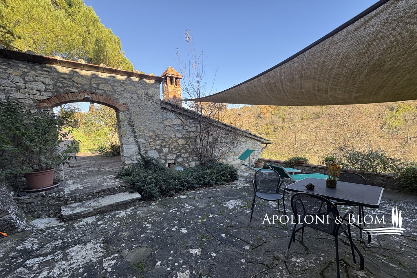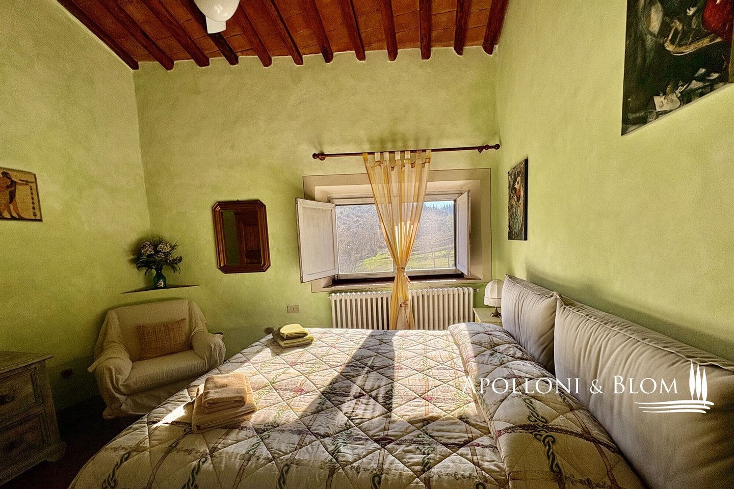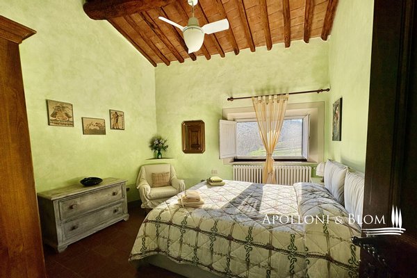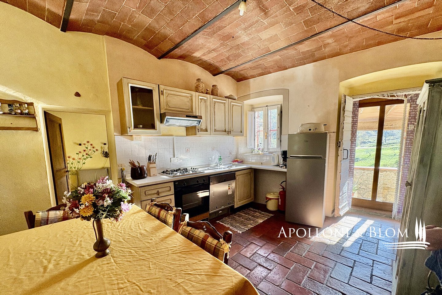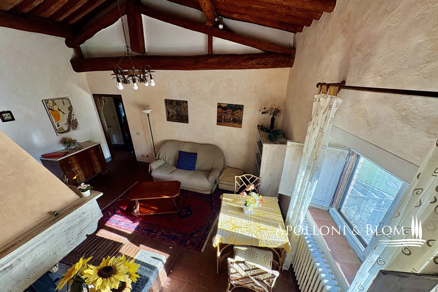 Typisch toskanisches Wohnhaus mit Panoramablick, Innenräumen mit Terrakotta-Böden sowie Gewölbe- und Balkendecken, die den Ursprung als Stall verraten. Das Haus hat einen Nord- und Südausgang, jeweils auf eine großzügige Terrasse. Das Haus „Casa Acacia“ weist eine raffinierte Synthese aus Geschichte und Komfort auf, die dank einer 1998 abgeschlossenen Restaurierung mit wiederholten Verbesserungen gekonnt erhalten wurde. Die Wohnung erstreckt sich über eine Fläche von 120 Quadratmetern auf zwei Ebenen, auf denen die traditionelle Ästhetik durch freiliegende Holzbalken und warme Terrakottaböden zelebriert wird. Auf der ersten Ebene empfängt Sie eine Wohnküche. Zwei romantische Schlafzimmer schließen sich an, auf derselben Ebene befindet sich ein Duschbad. Das Juwel der Wohnung ist ein reizender Wintergarten, der sich zur großen Terrasse in Südlage öffnet. Die zweite Etage erweitert die Vielseitigkeit der Wohnung mit einem sehr großen Wohnraum mit Holzofen sowie einem anschließenden Stufenbad. Des Weiteren gibt es ein weiteres großes Schlafzimmer sowie einen kleinen Küchenbereich, der in einen luxuriösen begehbaren Kleiderschrank oder ein zusätzliches großes Badezimmer umgebaut werden könnte. Zwei weitere Abstellräume sowie ein Heizkeller im Erdgeschoss, zusammen ca. 46 m², gehören ebenfalls zum Haus. Der logistische Komfort durch zwei reservierte Parkplätze ist gewährleistet. Die Immobilie befindet sich in ausgezeichnetem, bewohnbarem Zustand und ist bereit, diejenigen zu empfangen, die die authentische Eleganz historischer toskanischer Residenzen suchen.
