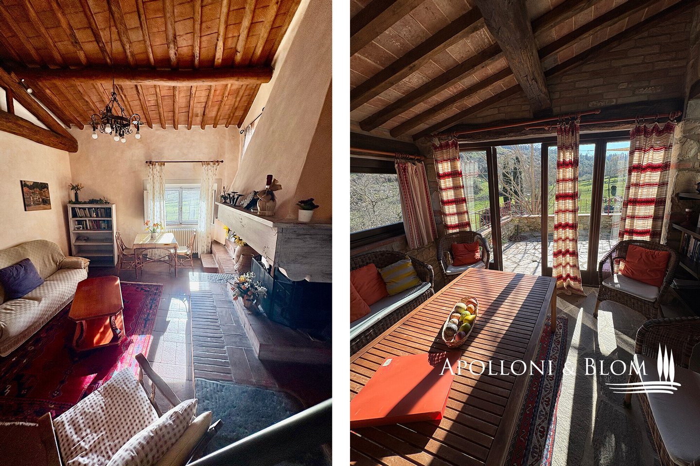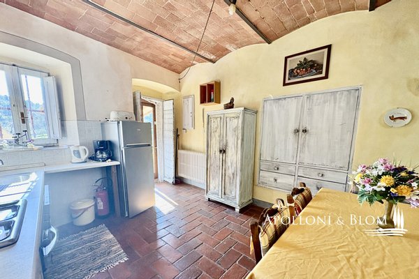 Typisch toskanisches Wohnhaus mit Panoramablick, Innenräumen mit Terrakotta-Böden sowie Gewölbe- und Balkendecken, die den Ursprung als Stall verraten. Das Haus hat einen Nord- und Südausgang, jeweils auf eine großzügige Terrasse. Das Haus „Casa
