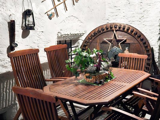 Für die wärmeren Jahreszeiten bietet die Liegenschaft einen idyllisch angelegten Garten mit einladender Terrasse und Blick auf den Hausberg von Steinfeld - Ihr perfekter Rückzugsort aus der Hektik des Alltags.