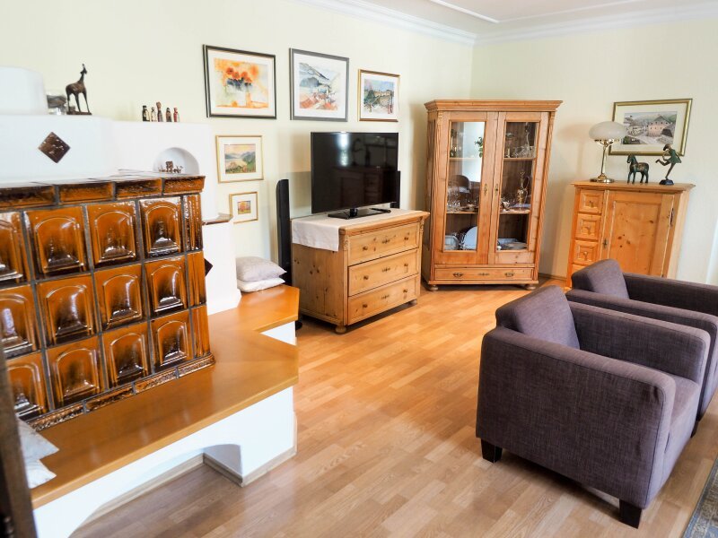 Ein Kachelofen im Wohnzimmer strahlt eine behagliche Wärme aus und lädt zum Verweilen ein.