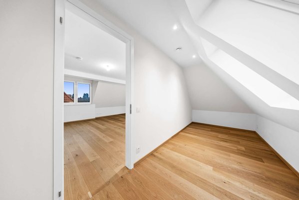 Der offen gestaltete Wohn- und Essbereich bildet das Herzstück der Wohnung und überzeugt durch edle Eichendielen, großformatige Feinsteinzeugfliesen sowie eine hochwertige, voll ausgestattete Designküche mit Markengeräten (Gaggenau oder vergleichbar), die bereits im Kaufpreis enthalten ist. Großzügige Fensterflächen mit dreifach verglasten Holzfenstern, elektrisch gesteuerten Raffstores sowie motorisierten Velux-Fenstern sorgen für optimale Lichtverhältnisse und ein hohes Maß an Wohnqualität.
