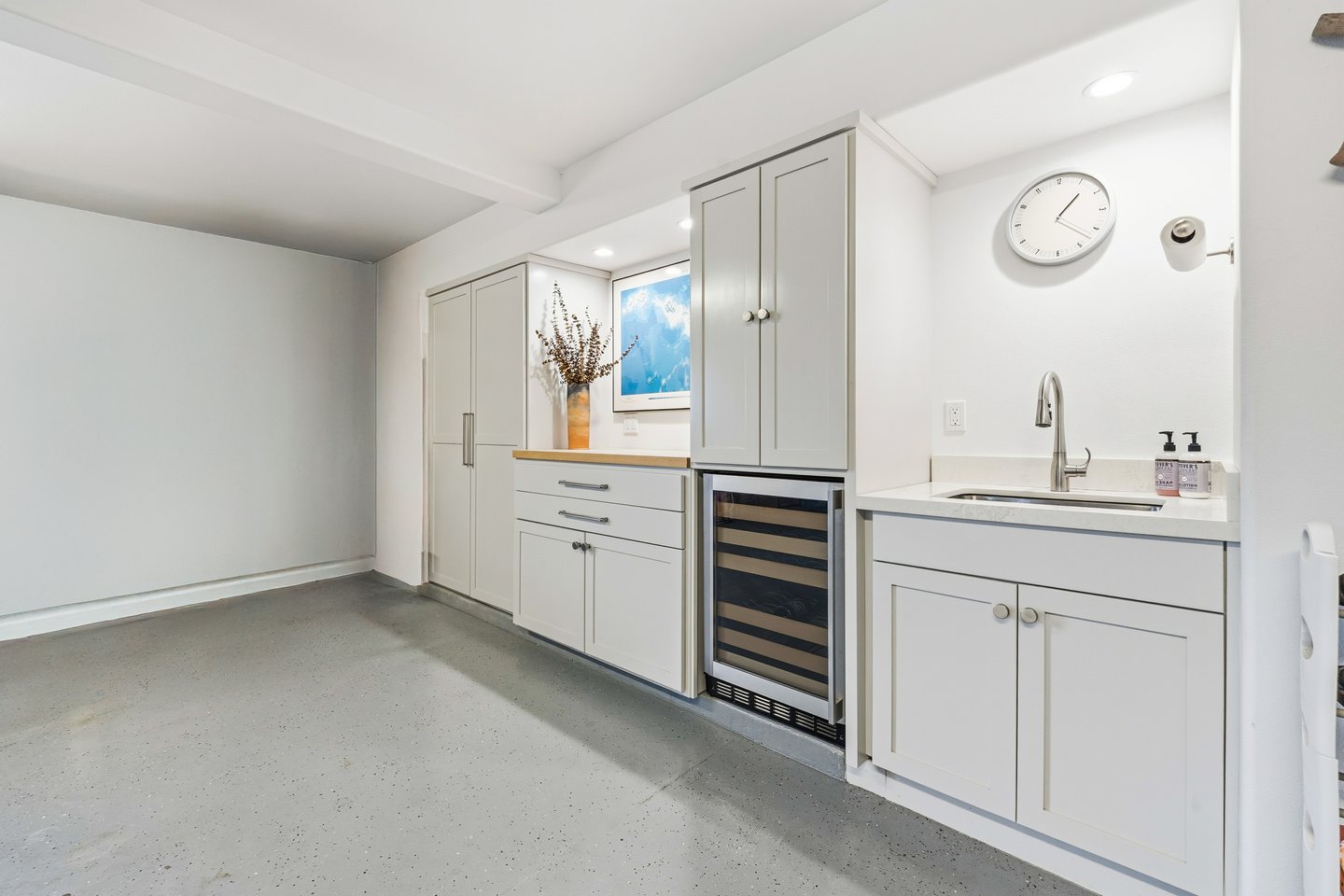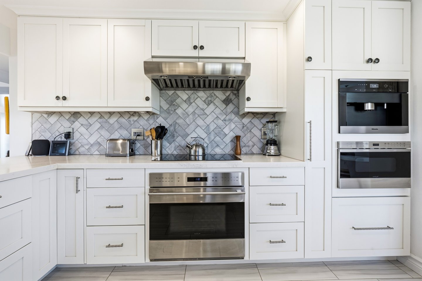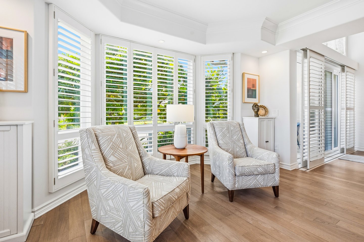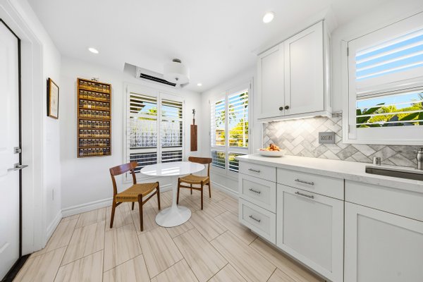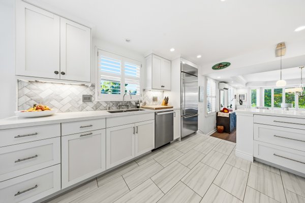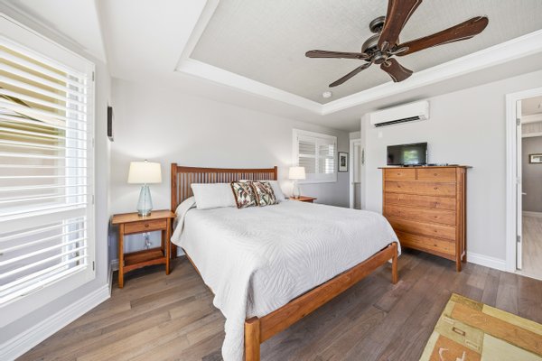 Ka'iulani of Princeville #75 – Luxus 2-Zimmer-/2,5BA-Reihenhaus mit Meerblick-Schlafzimmern Komplett renoviert im Jahr 2017, bietet dieses elegant aufgewertete Stadthaus in einem der führenden Viertel von Princeville anspruchsvolles Wohnen mit hochwertigen Oberflächen. Genießen Sie den Blick auf das Meer sowohl von den Schlafzimmersuiten im Obergeschoss als auch von einem dramatischen zweistöckigen Wohnbereich mit 18 Fuß hohen Decken, der das Haus mit natürlichem Licht erfüllt. Zu den Innenausstattungen gehören wiederverwendete Teakholz-Hartholzböden in einer treibholzgrauen Beize, Deckendecken, Zierleisten, Hunter-Douglas-Holzfensterläden, Soft-Close-Schränke, Kohler-Armaturen und Legrand-Dimm-Beleuchtungsregler. Mini-Split-Klimaanlagen versorgen die Schlafzimmer, Küche sowie den Wohn-/Essbereich und werden durch mehrere Deckenventilatoren ergänzt. Beide Schlafzimmer verfügen über eingebaute Pop-Out-Steckdosen an jedem Nachttisch. Die Designer-Küche verfügt über Quarz-Arbeitsplatten, eine Marmorrückwand, einen GE Monogram 36" Kühlschrank/Gefrierschrank, Wolf-Induktionskochfeld, Umluftofen, Dunstabzug, Schubladen-Mikrowelle sowie eine Miele-Kaffeestation und Geschirrspüler. Eine Quarz-Frühstücksbar bietet Platz für drei. Beide Schlafzimmer-Suiten verfügen über wunderschön gestaltete Bäder mit Vinyl-Grastuch-Wandverkleidungen. Die Hauptsuite umfasst einen entfeuchteten Kleiderschrank und ein vom Spa inspiriertes Bad mit einem Wasserfall aus Felswand über der Badewanne sowie zwei begehbare Duschen mit Regenköpfen und wandmontierten Düsen. Die Gästesuite bietet eine maßgefertigte Fensterbank mit eingebauten Aufbewahrungsschubladen und Meerblick. Weitere Merkmale sind gefliester Eingang, Küche, Waschküche und Bäder; zentraler Wassermanifold; Samsung Dampfwaschmaschine/-trockner; und eine fertige Garage mit maßgefertigten Schränken, einer 48" Werkbank, einem Spülbecken, einem GE Monogram Weinkühlschrank und Fenstern mit Garagentoren. Ka'iulani #75 vereint Luxus, Komfort, durchdachtes Design und Schlafzimmer mit Meerblick in einer makellos gepflegten Gemeinschaft.