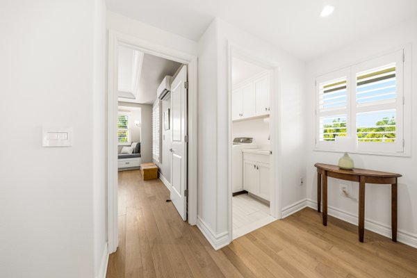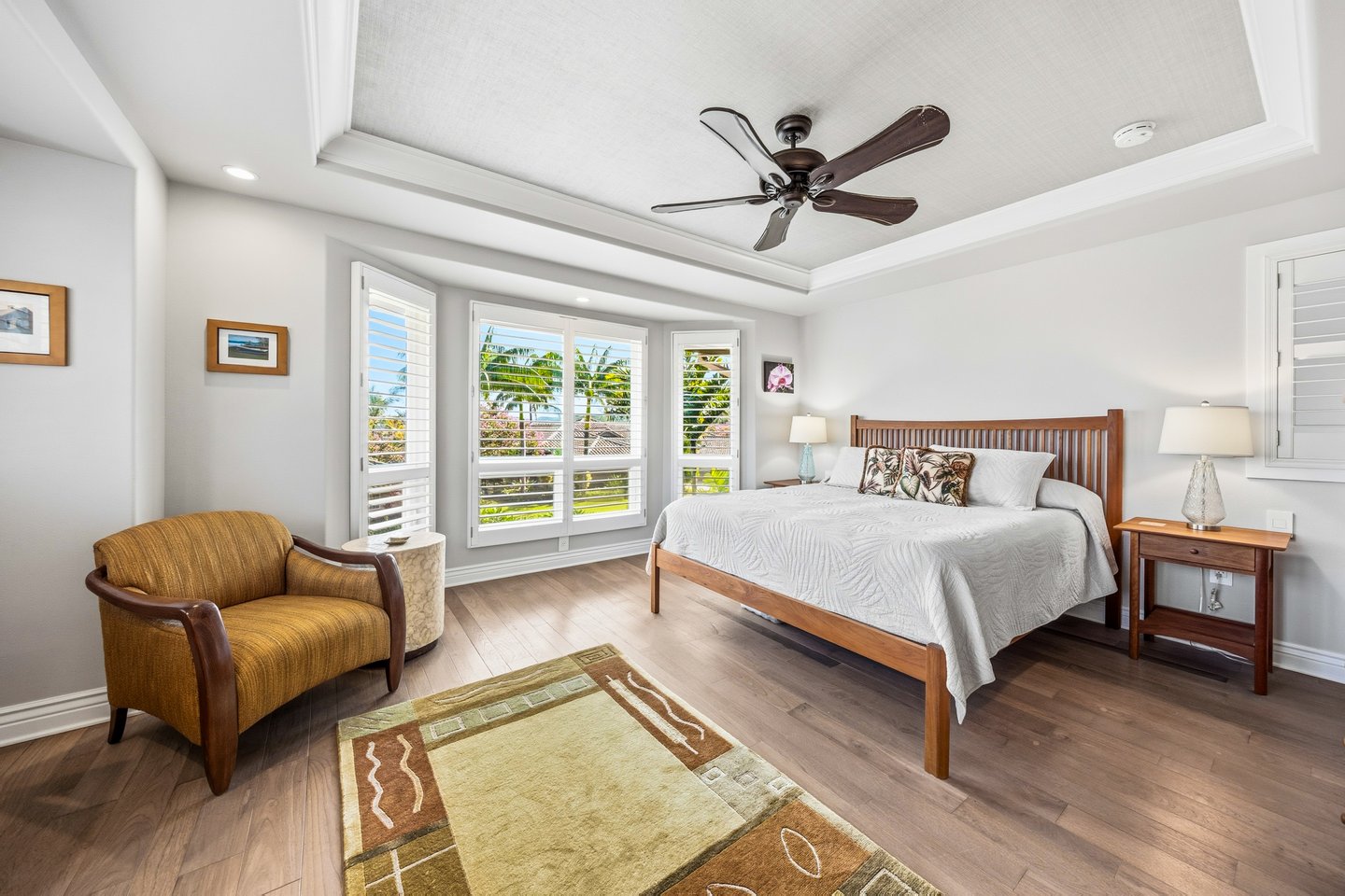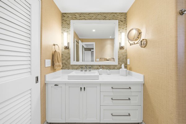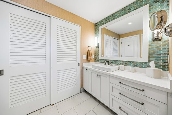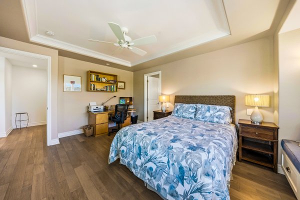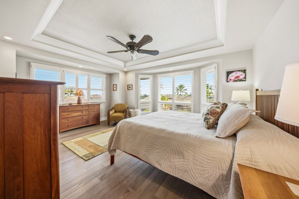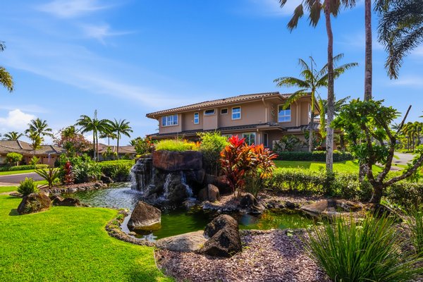 Ka'iulani of Princeville #75 – Luxus 2-Zimmer-/2,5BA-Reihenhaus mit Meerblick-Schlafzimmern Komplett renoviert im Jahr 2017, bietet dieses elegant aufgewertete Stadthaus in einem der führenden Viertel von Princeville anspruchsvolles Wohnen mit hochwertigen Oberflächen. Genießen Sie den Blick auf das Meer sowohl von den Schlafzimmersuiten im Obergeschoss als auch von einem dramatischen zweistöckigen Wohnbereich mit 18 Fuß hohen Decken, der das Haus mit natürlichem Licht erfüllt. Zu den Innenausstattungen gehören wiederverwendete Teakholz-Hartholzböden in einer treibholzgrauen Beize, Deckendecken, Zierleisten, Hunter-Douglas-Holzfensterläden, Soft-Close-Schränke, Kohler-Armaturen und Legrand-Dimm-Beleuchtungsregler. Mini-Split-Klimaanlagen versorgen die Schlafzimmer, Küche sowie den Wohn-/Essbereich und werden durch mehrere Deckenventilatoren ergänzt. Beide Schlafzimmer verfügen über eingebaute Pop-Out-Steckdosen an jedem Nachttisch. Die Designer-Küche verfügt über Quarz-Arbeitsplatten, eine Marmorrückwand, einen GE Monogram 36" Kühlschrank/Gefrierschrank, Wolf-Induktionskochfeld, Umluftofen, Dunstabzug, Schubladen-Mikrowelle sowie eine Miele-Kaffeestation und Geschirrspüler. Eine Quarz-Frühstücksbar bietet Platz für drei. Beide Schlafzimmer-Suiten verfügen über wunderschön gestaltete Bäder mit Vinyl-Grastuch-Wandverkleidungen. Die Hauptsuite umfasst einen entfeuchteten Kleiderschrank und ein vom Spa inspiriertes Bad mit einem Wasserfall aus Felswand über der Badewanne sowie zwei begehbare Duschen mit Regenköpfen und wandmontierten Düsen. Die Gästesuite bietet eine maßgefertigte Fensterbank mit eingebauten Aufbewahrungsschubladen und Meerblick. Weitere Merkmale sind gefliester Eingang, Küche, Waschküche und Bäder; zentraler Wassermanifold; Samsung Dampfwaschmaschine/-trockner; und eine fertige Garage mit maßgefertigten Schränken, einer 48" Werkbank, einem Spülbecken, einem GE Monogram Weinkühlschrank und Fenstern mit Garagentoren. Ka'iulani #75 vereint Luxus, Komfort, durchdachtes Design und Schlafzimmer mit Meerblick in einer makellos gepflegten Gemeinschaft.