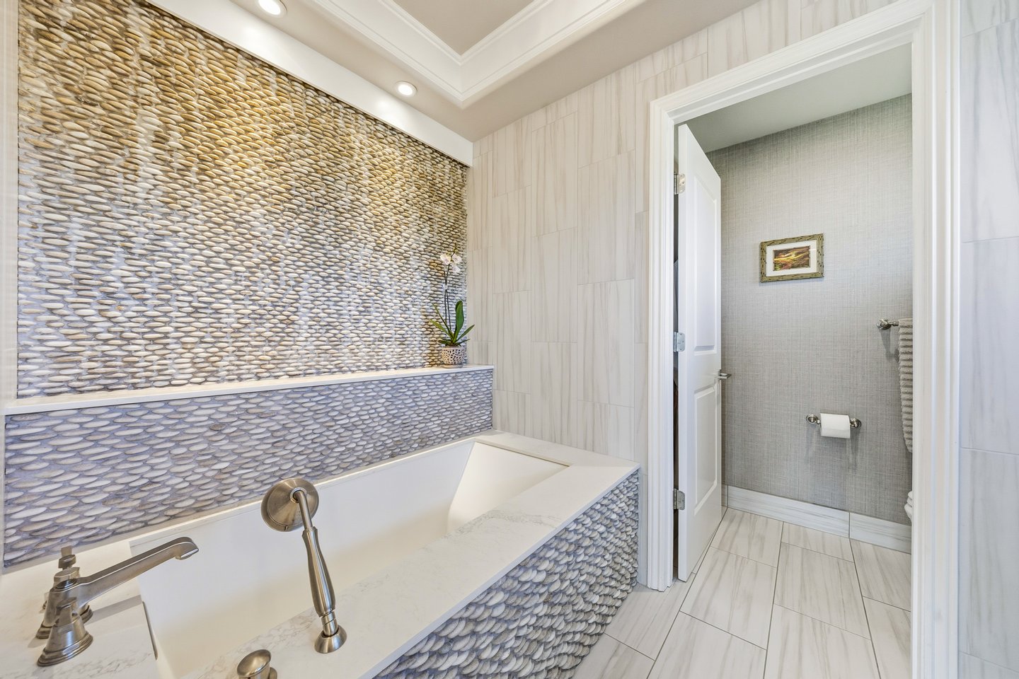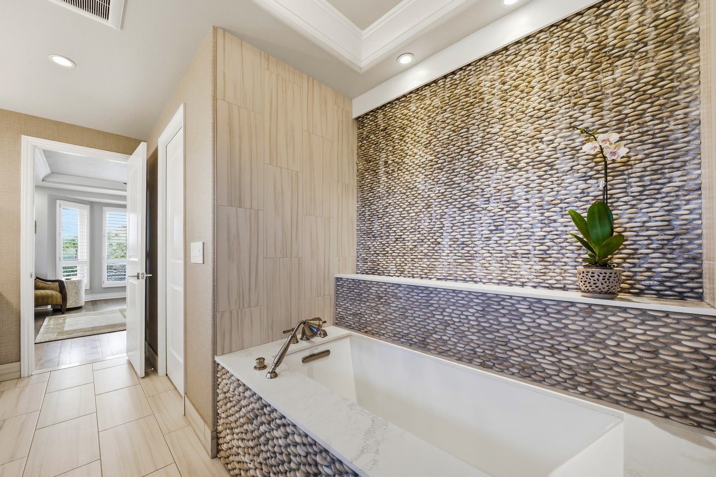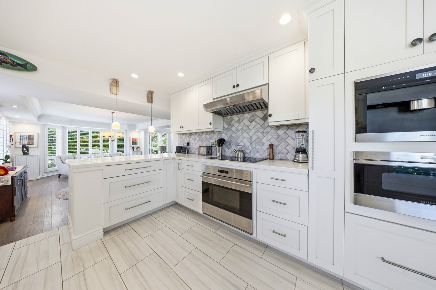 Ka'iulani of Princeville #75 – Luxus 2-Zimmer-/2,5BA-Reihenhaus mit Meerblick-Schlafzimmern Komplett renoviert im Jahr 2017, bietet dieses elegant aufgewertete Stadthaus in einem der führenden Viertel von Princeville anspruchsvolles Wohnen mit hochwertigen Oberflächen. Genießen Sie den Blick auf das Meer sowohl von den Schlafzimmersuiten im Obergeschoss als auch von einem dramatischen zweistöckigen Wohnbereich mit 18 Fuß hohen Decken, der das Haus mit natürlichem Licht erfüllt. Zu den Innenausstattungen gehören wiederverwendete Teakholz-Hartholzböden in einer treibholzgrauen Beize, Deckendecken, Zierleisten, Hunter-Douglas-Holzfensterläden, Soft-Close-Schränke, Kohler-Armaturen und Legrand-Dimm-Beleuchtungsregler. Mini-Split-Klimaanlagen versorgen die Schlafzimmer, Küche sowie den Wohn-/Essbereich und werden durch mehrere Deckenventilatoren ergänzt. Beide Schlafzimmer verfügen über eingebaute Pop-Out-Steckdosen an jedem Nachttisch. Die Designer-Küche verfügt über Quarz-Arbeitsplatten, eine Marmorrückwand, einen GE Monogram 36" Kühlschrank/Gefrierschrank, Wolf-Induktionskochfeld, Umluftofen, Dunstabzug, Schubladen-Mikrowelle sowie eine Miele-Kaffeestation und Geschirrspüler. Eine Quarz-Frühstücksbar bietet Platz für drei. Beide Schlafzimmer-Suiten verfügen über wunderschön gestaltete Bäder mit Vinyl-Grastuch-Wandverkleidungen. Die Hauptsuite umfasst einen entfeuchteten Kleiderschrank und ein vom Spa inspiriertes Bad mit einem Wasserfall aus Felswand über der Badewanne sowie zwei begehbare Duschen mit Regenköpfen und wandmontierten Düsen. Die Gästesuite bietet eine maßgefertigte Fensterbank mit eingebauten Aufbewahrungsschubladen und Meerblick. Weitere Merkmale sind gefliester Eingang, Küche, Waschküche und Bäder; zentraler Wassermanifold; Samsung Dampfwaschmaschine/-trockner; und eine fertige Garage mit maßgefertigten Schränken, einer 48" Werkbank, einem Spülbecken, einem GE Monogram Weinkühlschrank und Fenstern mit Garagentoren. Ka'iulani #75 vereint Luxus, Komfort, durchdachtes Design und Schlafzimmer mit Meerblick in einer makellos gepflegten Gemeinschaft.