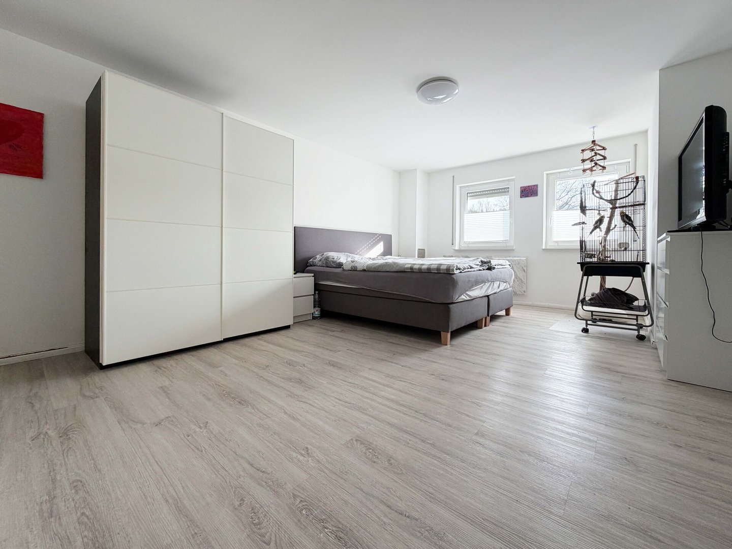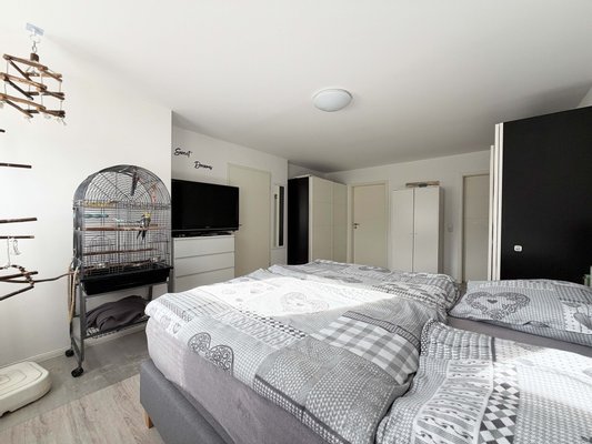 Nach Betreten der Diele können Sie Ihre Garderobe bequem ablegen. Auf der rechten Seite befindet sich das große Schlafzimmer. Auf mehr als 22 m² ist vieles möglich: ein eigener Bereich für größere Kids, ein herrliches Gästezimmer oder ein tolles Arbeitszimmer.
