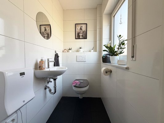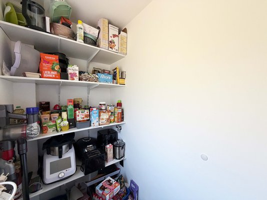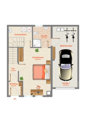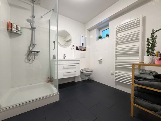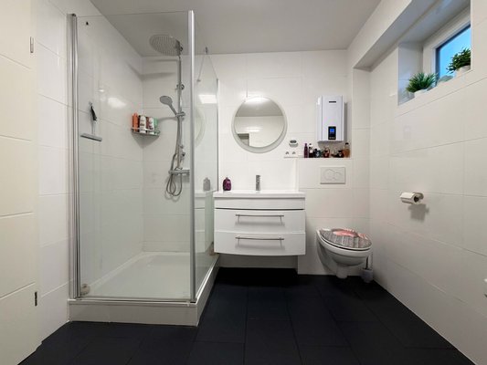 Das moderne Badezimmer nebenan ist perfekt für einen guten Start in den Tag. Die Duschkabine ist angenehm groß. Daneben liegt der Technikraum. Neben der modernen Technik sind hier Waschmaschine und Trockner platziert. Weiterer Stauraum ist in dem ca. 9 m² großen Technikraum vorhanden.