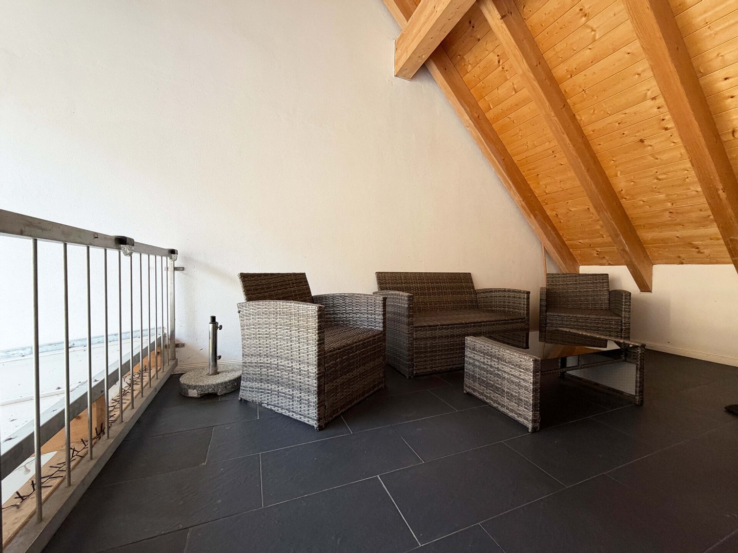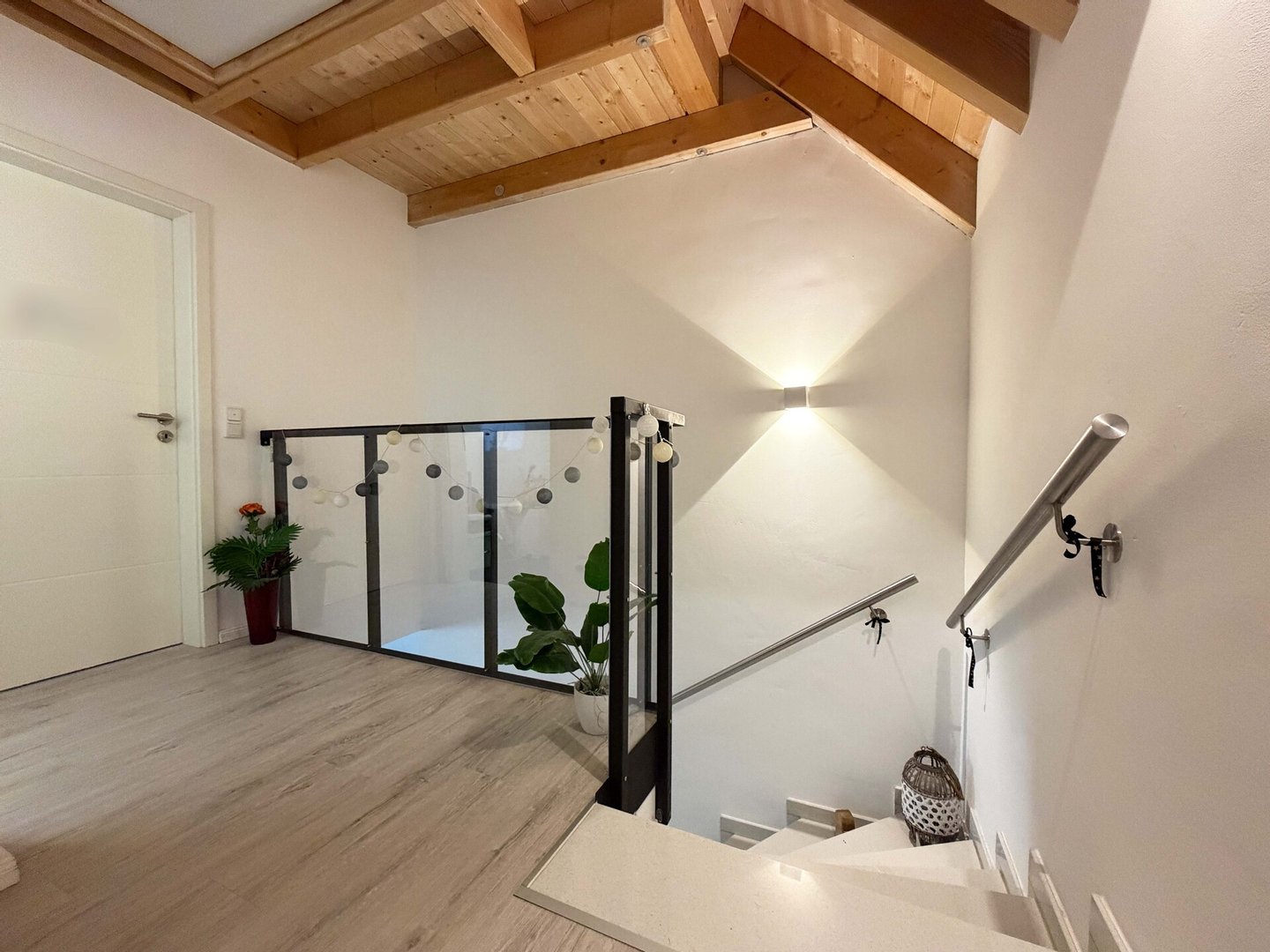 Das Obergeschoss erreichen Sie entweder über die massive Steintreppe vom Erdgeschoss aus oder über den zweiten Eingang (Rößlesweg).