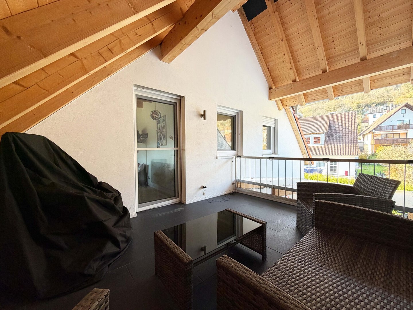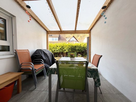 Vom Essbereich aus gelangen Sie auf die überdachte Terrasse. Genießen Sie hier den Absacker am Abend oder den ersten Kaffee am Morgen an der frischen Luft.