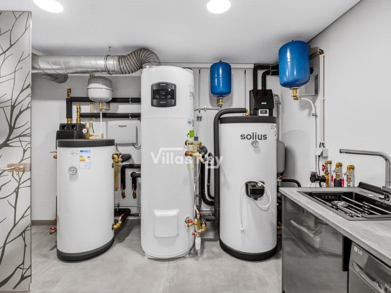 Solarpaneele, Klimaanlage und Fußbodenheizung (elektrisch im Untergeschoss, über Wärmepumpe in den oberen Etagen)