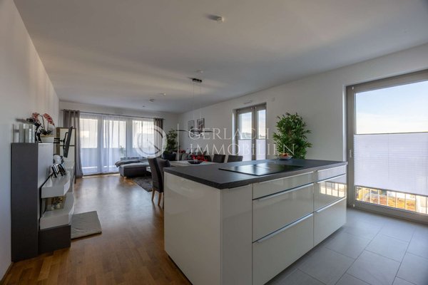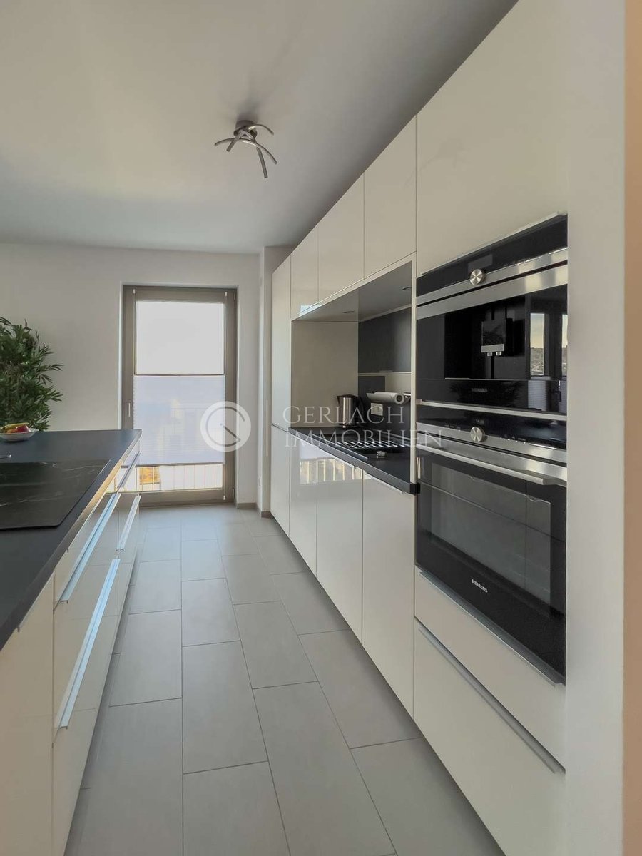 Schon das Ankommen ist angenehm: Sie parken bequem in der Tiefgarage und fahren mit dem Aufzug direkt in Ihre Wohnetage. Der ca. 40 m² große Wohn-Essbereich empfängt Sie mit Wärme und Gemütlichkeit, unterstrichen durch das geölte Eiche-Echtholzparkett. Das Herzstück ist die offene Küche mit Kochinsel und Siemens-Markengeräten – ideal für kommunikative Abende. Vom Wohnbereich treten Sie auf den Balkon mit Weitblick.