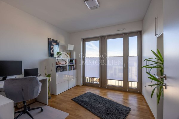 Die Wohnung bietet zwei Schlafzimmer. Das zweite Zimmer eignet sich perfekt als Büro oder Gästezimmer und ist bereits mit einem maßgefertigten Einbauschrank vom Schreiner ausgestattet. Ein echter Luxus sind die zwei Bäder: Ein Hauptbad mit Wanne und ein zweites Duschbad mit ebenerdiger Dusche. Ein praktischer Abstellraum mit Waschmaschinen-Anschluss in der Wohnung erspart Ihnen unnötige Wege.