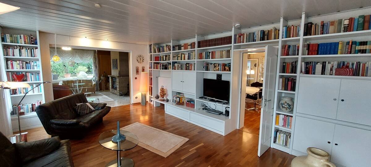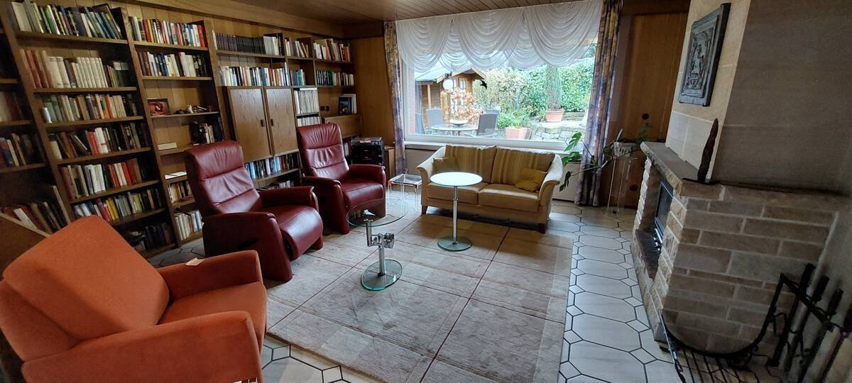 Wohn- und Kaminzimmer mit Bibliothek