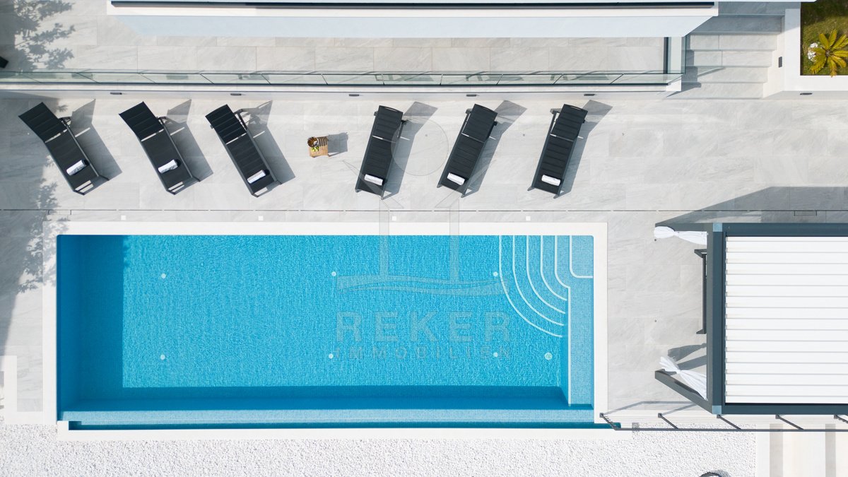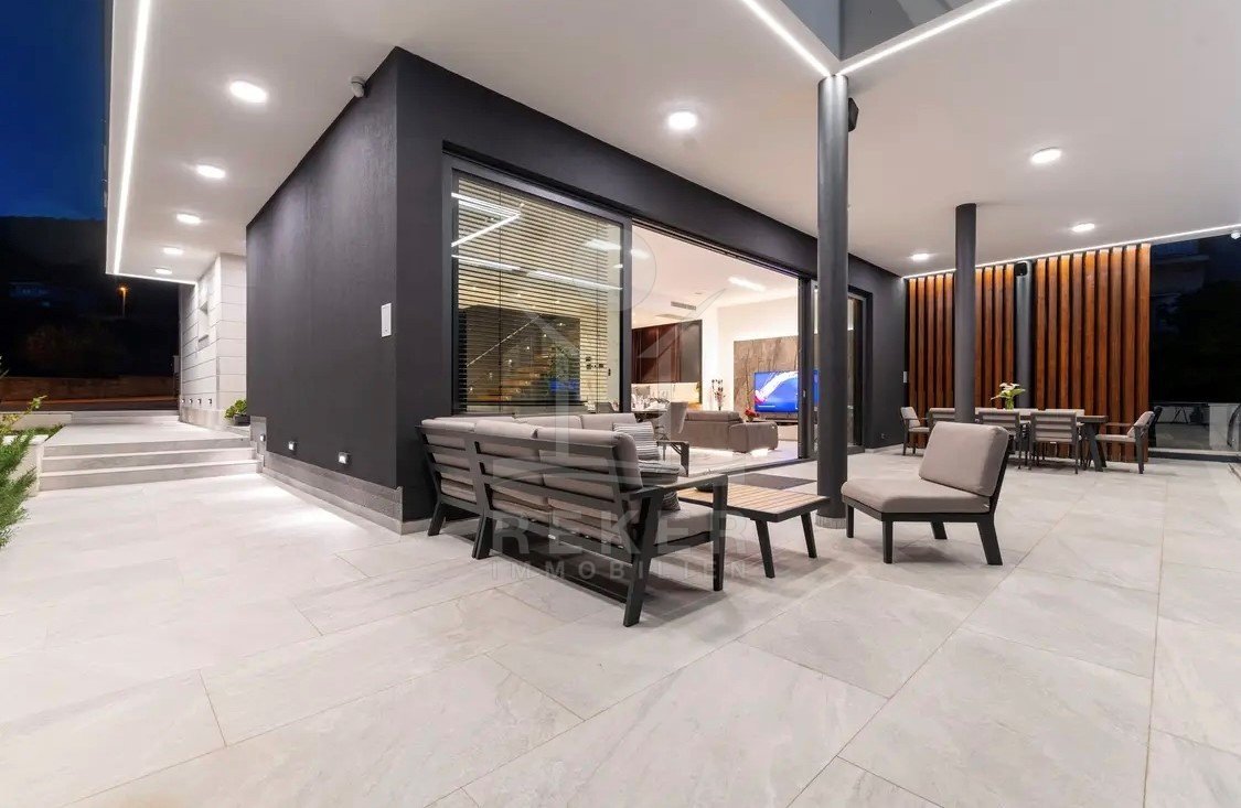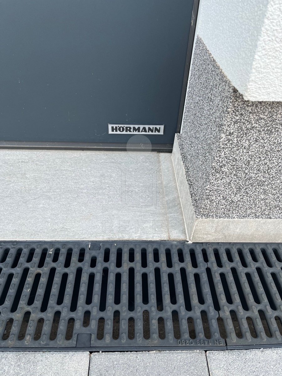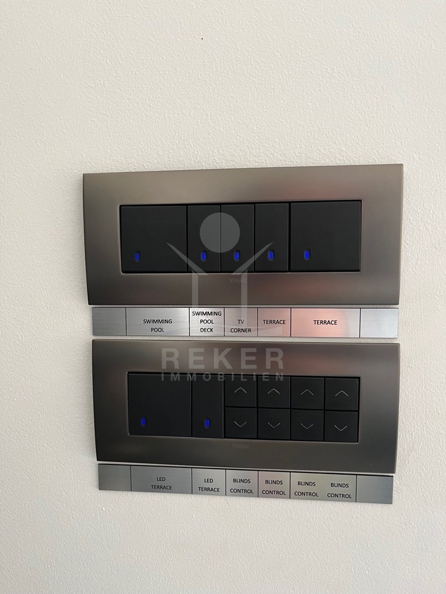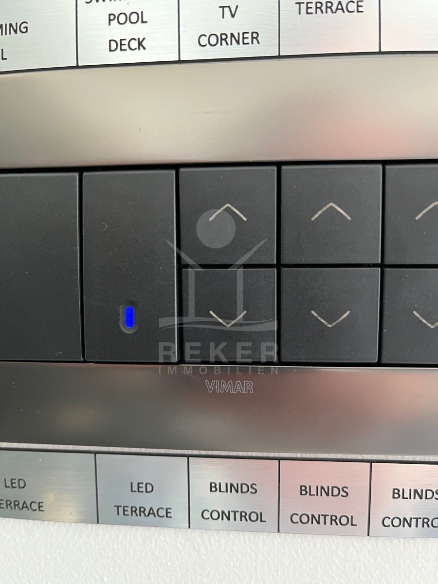 Die Zufahrt erfolgt über eine 3,5 bis 5 m breite Straße, rund 300 m bis zum Tor. Parken ist komfortabel in der Doppelgarage sowie auf dem großzügigen Vorplatz möglich. Das Grundstück umfasst ca. 1.100 m², davon rund 850 m² frei nutzbare Fläche. Es gliedert sich in Gartenbereiche, Wege und klar definierte Zonen mit weißen, abgerundeten Natursteinen. Mittelpunkt des Außenbereichs ist der 48 m² große, beheizte Infinity-Pool mit moderner Salzwasseraufbereitung. Direkt angeschlossen ist ein ca. 150 m² großes Sonnendeck mit rutschhemmenden Porzellanfliesen. Eine elektrische Biopergola mit 12 m² sowie eine Außendusche ergänzen diesen Bereich. Fünf quer verlaufende Stützmauern, mit poliertem weißem Stein verkleidet, folgen der leichten Hanglage mit einer Höhendifferenz von rund 6 m und betonen die Aussicht. Das Areal ist vollständig eingefriedet und über ein Automatiktor zugänglich. Zusätzlich stehen auf der Nord- und Südseite Fußgängertore zur Verfügung. Die Außenbeleuchtung wird per LUXOMAT gesteuert und verbindet Orientierung mit Sicherheit, unterstützt durch 9 Kameras (CCTV) und eine Alarmanlage. Vor der Garage steht eine großzügige Rangierfläche für mindestens drei weitere Fahrzeuge zur Verfügung. Die Liegenschaft ist an einen eigenen Abwassertank angeschlossen, mit 100 mm Leitung und Entleerung per Saugfahrzeug. Der öffentliche Kanalbau ist im Gange und soll im gesamten Quartier bis Ende 2026 abgeschlossen sein.