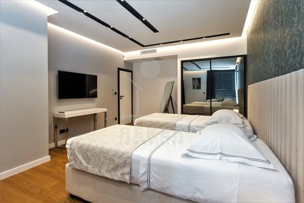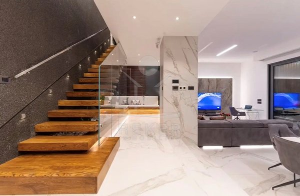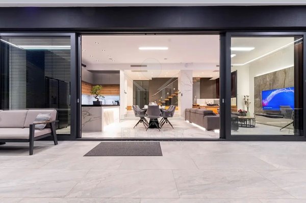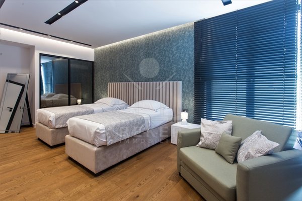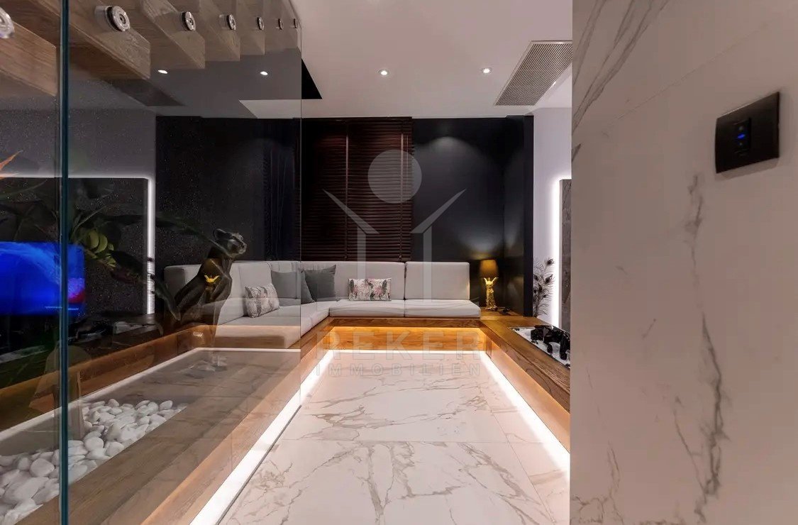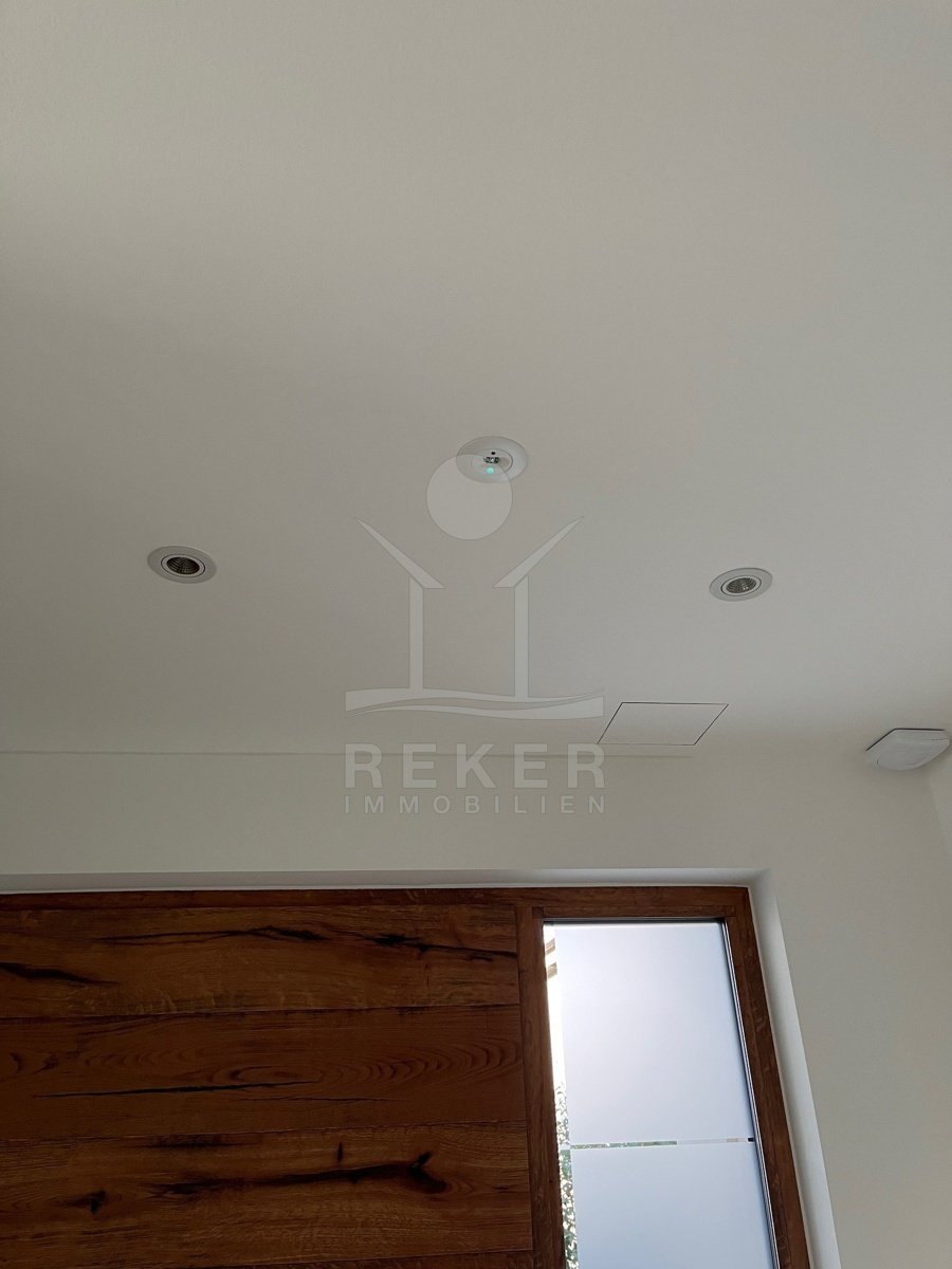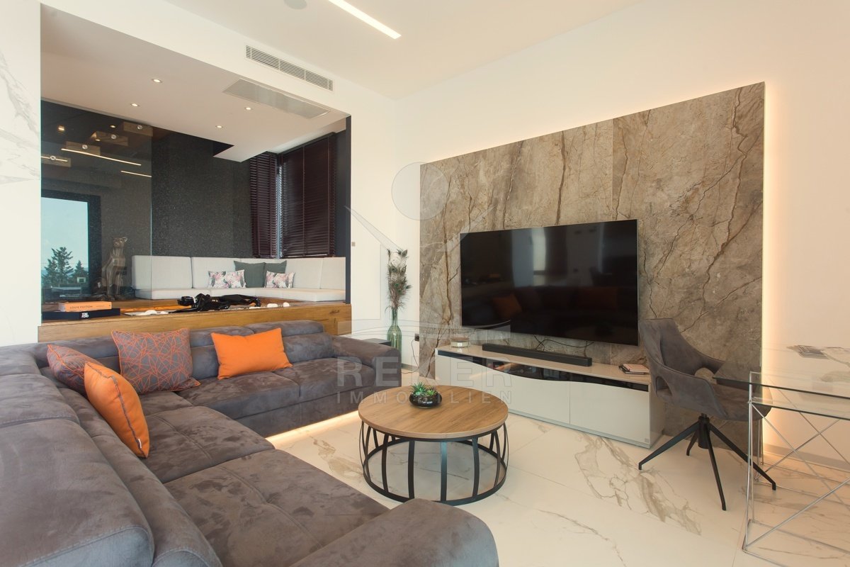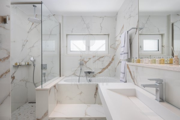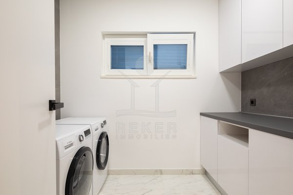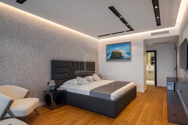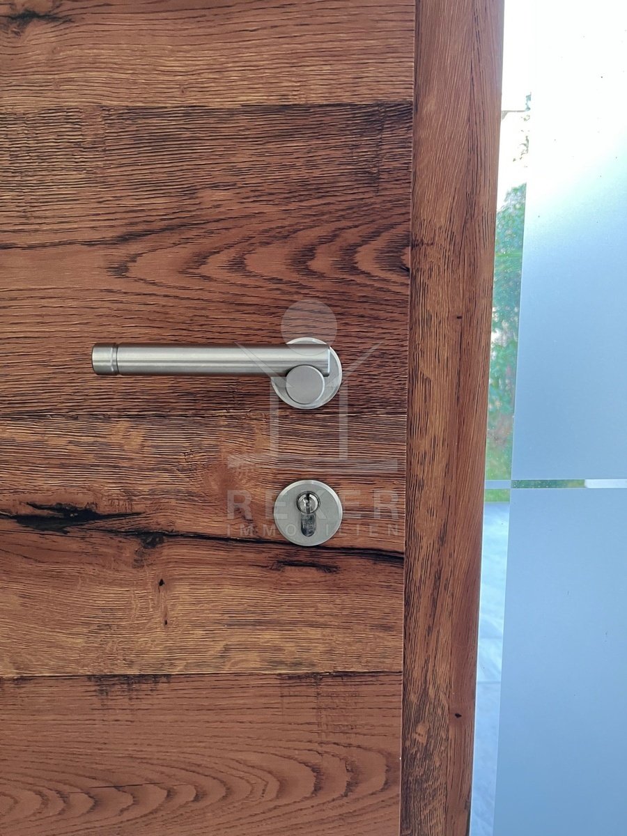 Die Zufahrt erfolgt über eine 3,5 bis 5 m breite Straße, rund 300 m bis zum Tor. Parken ist komfortabel in der Doppelgarage sowie auf dem großzügigen Vorplatz möglich. Das Grundstück umfasst ca. 1.100 m², davon rund 850 m² frei nutzbare Fläche. Es gliedert sich in Gartenbereiche, Wege und klar definierte Zonen mit weißen, abgerundeten Natursteinen. Mittelpunkt des Außenbereichs ist der 48 m² große, beheizte Infinity-Pool mit moderner Salzwasseraufbereitung. Direkt angeschlossen ist ein ca. 150 m² großes Sonnendeck mit rutschhemmenden Porzellanfliesen. Eine elektrische Biopergola mit 12 m² sowie eine Außendusche ergänzen diesen Bereich. Fünf quer verlaufende Stützmauern, mit poliertem weißem Stein verkleidet, folgen der leichten Hanglage mit einer Höhendifferenz von rund 6 m und betonen die Aussicht. Das Areal ist vollständig eingefriedet und über ein Automatiktor zugänglich. Zusätzlich stehen auf der Nord- und Südseite Fußgängertore zur Verfügung. Die Außenbeleuchtung wird per LUXOMAT gesteuert und verbindet Orientierung mit Sicherheit, unterstützt durch 9 Kameras (CCTV) und eine Alarmanlage. Vor der Garage steht eine großzügige Rangierfläche für mindestens drei weitere Fahrzeuge zur Verfügung. Die Liegenschaft ist an einen eigenen Abwassertank angeschlossen, mit 100 mm Leitung und Entleerung per Saugfahrzeug. Der öffentliche Kanalbau ist im Gange und soll im gesamten Quartier bis Ende 2026 abgeschlossen sein.