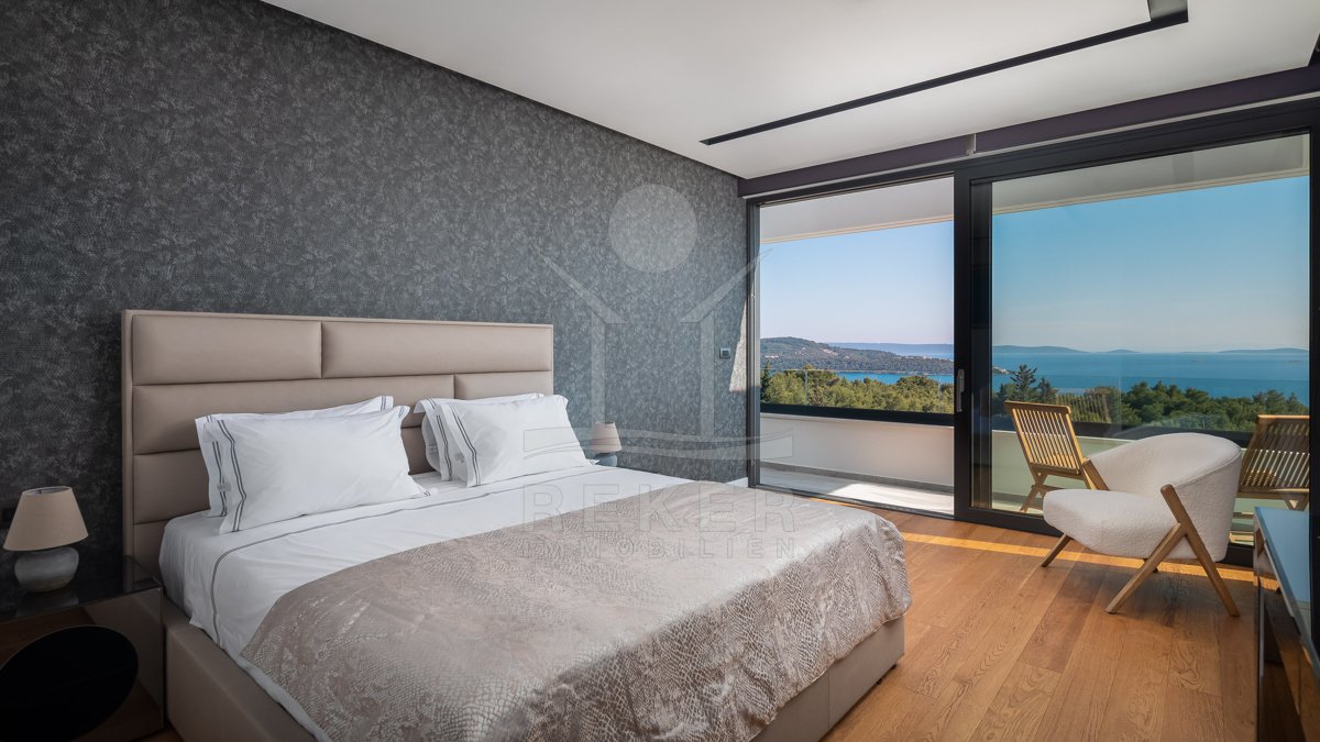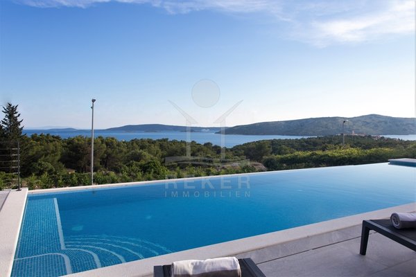Die Villa befindet sich in ruhiger Höhenlage nahe Trogir in Dalmatien, am Ende einer Sackgasse mit sehr wenig Verkehr. Das sorgt für Privatsphäre und entspannte Abläufe. Der Flughafen Split ist ca. 10 km entfernt, die Stadt Split ca. 30 km. Richtung Westen erreichen Sie Rogoznica, Primošten, Šibenik sowie den Krka-Nationalpark im Umkreis bis 60 km. Zur Adria gehen Sie in etwa 10 Minuten durch den Wald, in der Nähe des Hotel Medena. Das Grundstück befindet sich rund 60 m über dem Meer und ist nach Süden ausgerichtet. Der Blick reicht über ein geschütztes Waldgebiet bis zur gegliederten Küste mit zahlreichen Inseln.