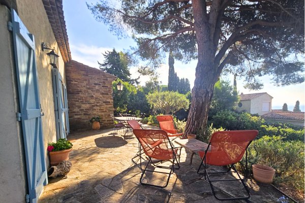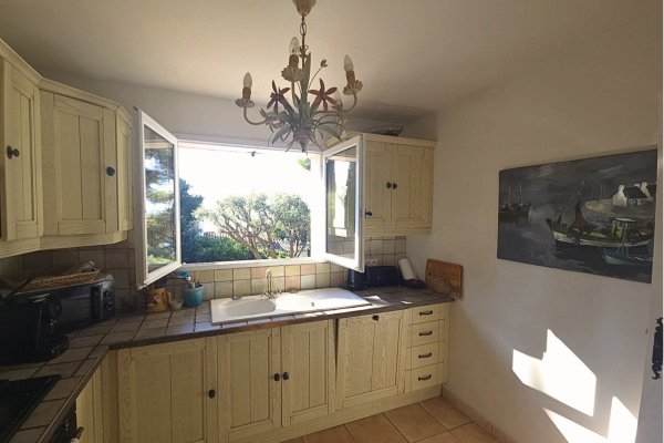Weniger als zehn Gehminuten von den Stränden von Jean Blanc und Aiguebelle entfernt, liegt diese provenzalische Villa in einer geschützten Umgebung und bietet wunderschöne Ausblicke auf die umliegende Vegetation, das Meer und die Inseln. Die Immobilie wurde auf einem 1.137 m² großen Grundstück errichtet, bietet etwa 119 m² Wohnfläche, verteilt auf zwei Ebenen, verfügt über fünf Schlafzimmer, was sie als Hauptwohnsitz, Zweitwohnsitz oder Investitionsimmobilie geeignet macht. Die Gartenebene verfügt über ein Wohnzimmer mit Kathedralendecke und Kamin, das auf eine lange, nach Süden ausgerichtete Terrasse mit zwei Sonnenschirmkiefern führt, sowie auf eine teilweise überdachte Terrasse von etwa 50 m² mit einem eingebauten Mauergrill. Die Küche, die von Meerblick profitiert, öffnet sich direkt zur Terrasse. Drei Schlafzimmer haben direkten Zugang zum Außenbereich. Ein Badezimmer mit WC und ein Duschraum mit WC vervollständigen diese Ebene. Das Obergeschoss, das über einige Stufen zugänglich ist, besteht aus zwei Schlafzimmern, von denen eines in einer Zwischenebene liegt, die auf eine 50 m² große Terrasse mit beeindruckenden Ausblicken auf das Meer und die natürliche Umgebung ausgerichtet ist, sowie einen Umkleideraum, ein Badezimmer, eine Toilette und einen Lagerraum, der von der Terrasse aus zugänglich ist. Der Garten ist mit Blumen und Obstbäumen bepflanzt, und eine Außendusche vervollständigt die Annehmlichkeiten des Grundstücks. Die Immobilie bietet eine ruhige und helle Wohnumgebung, unmittelbar in unmittelbarer Nähe zu den Stränden, in einer typisch mediterranen Atmosphäre. Kontaktieren Sie mich schnell: +33 7 50 63 85 16 oder . Georgelin MALECKI Immobilienberater RSAC 981 018 971