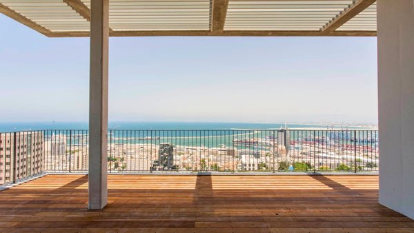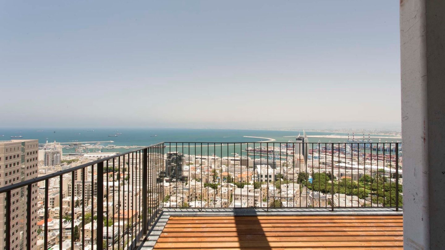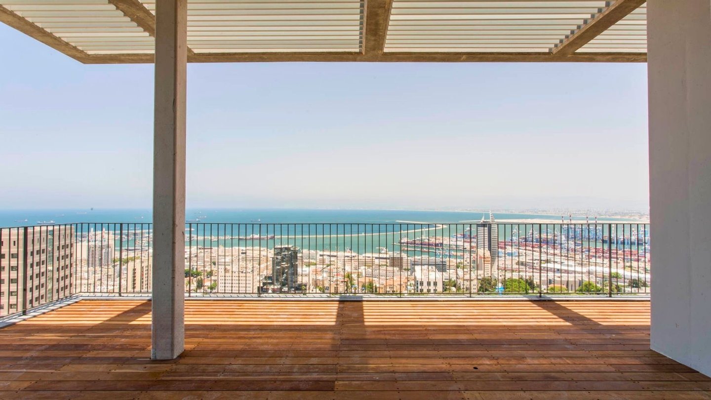 Riesiges Penthouse mit vier Schlafzimmern, das sich über eine halbe Etage erstreckt, 180 m² (1.938 sq ft) mit außergewöhnlich geräumigen Sonnenbalkonen von 74 m² (797 sq ft) und extra hohen Decken. Im obersten Stock von Haifa gelegen, bietet dieses