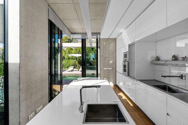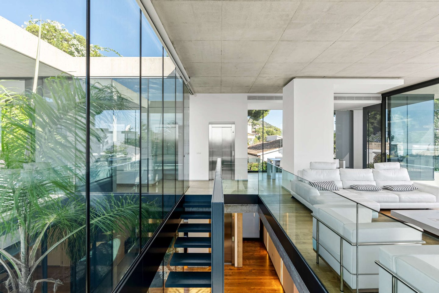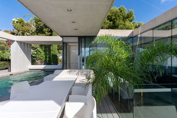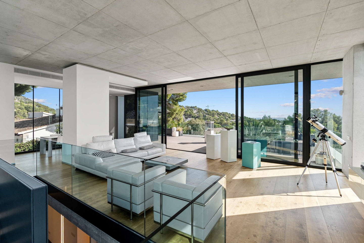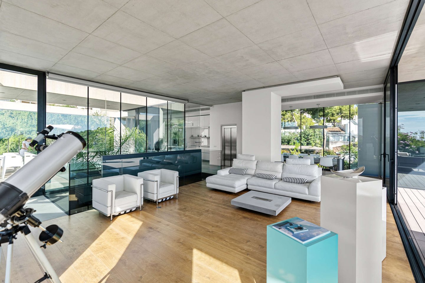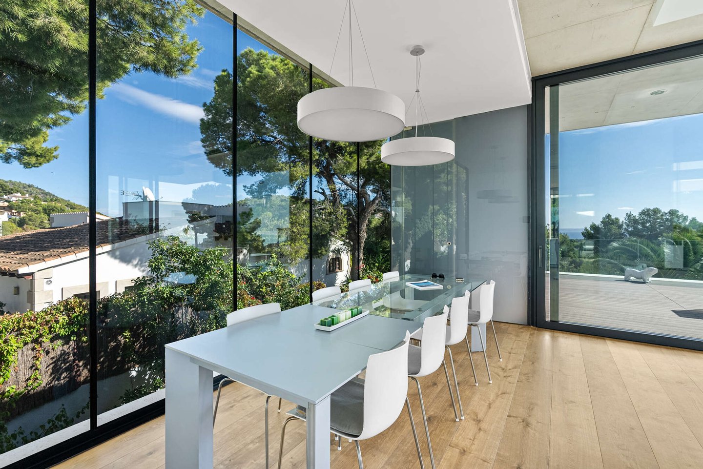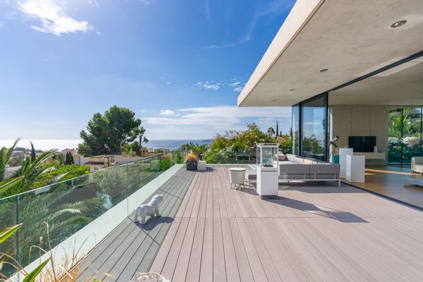 Das Herzstück der Villa bildet der obere Wohn- und Essbereich. Hier öffnet sich die Architektur über raumhohe Glasfronten zur glitzernden Weite des Mittelmeers.