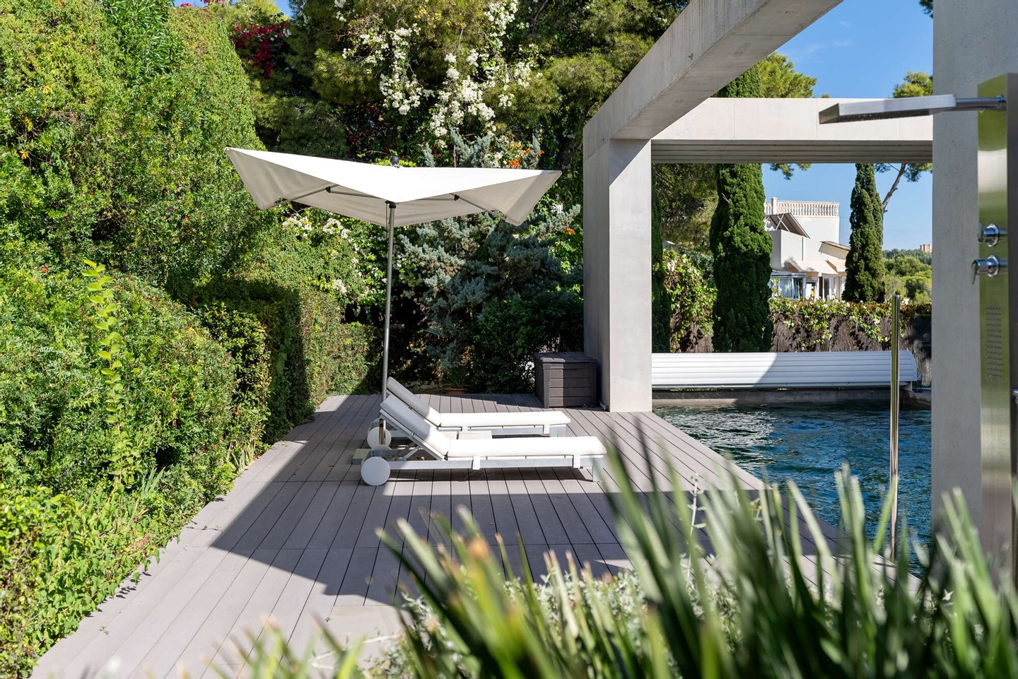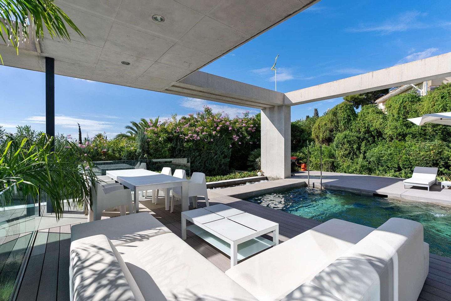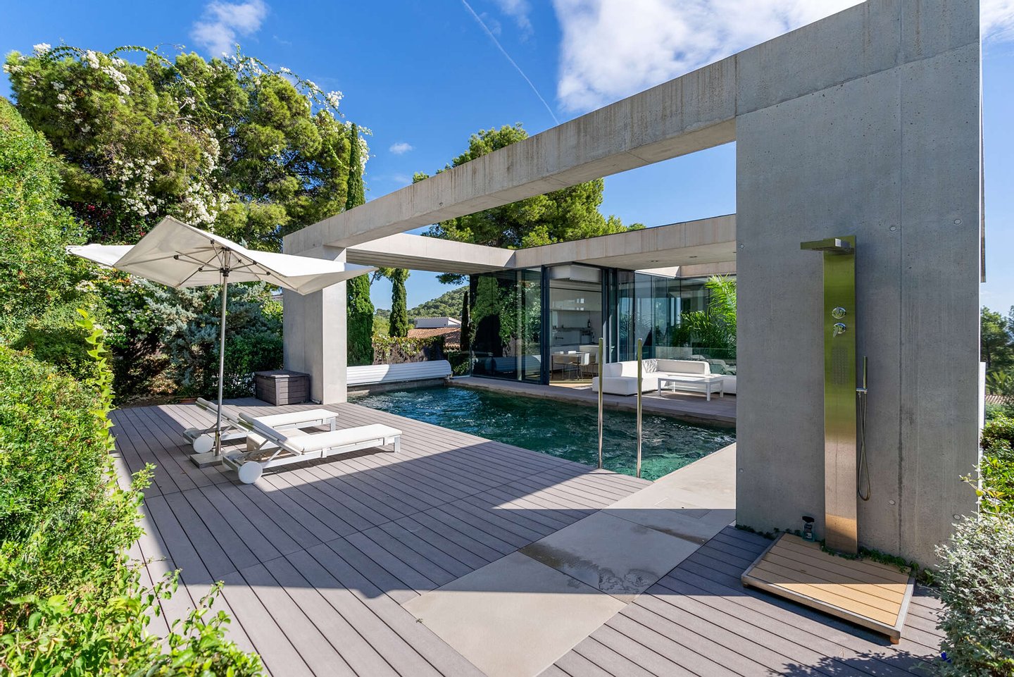 Im Freien entfaltet sich ein Lebensgefühl von mediterraner Leichtigkeit: Ein beheizbarer Pool mit Jacuzzi, weitläufige Terrassen und ein liebevoll angelegter Garten schaffen eine private Oase, in der Entspannung und Genuss mühelos ineinanderfließen. Ergänzt wird das Anwesen durch ein großzügiges Untergeschoss mit Garage für bis zu vier Fahrzeuge, weiterem Stauraum und einem zusätzlichen Badezimmer – ein diskreter Luxus, der das Gesamtbild vollendet.