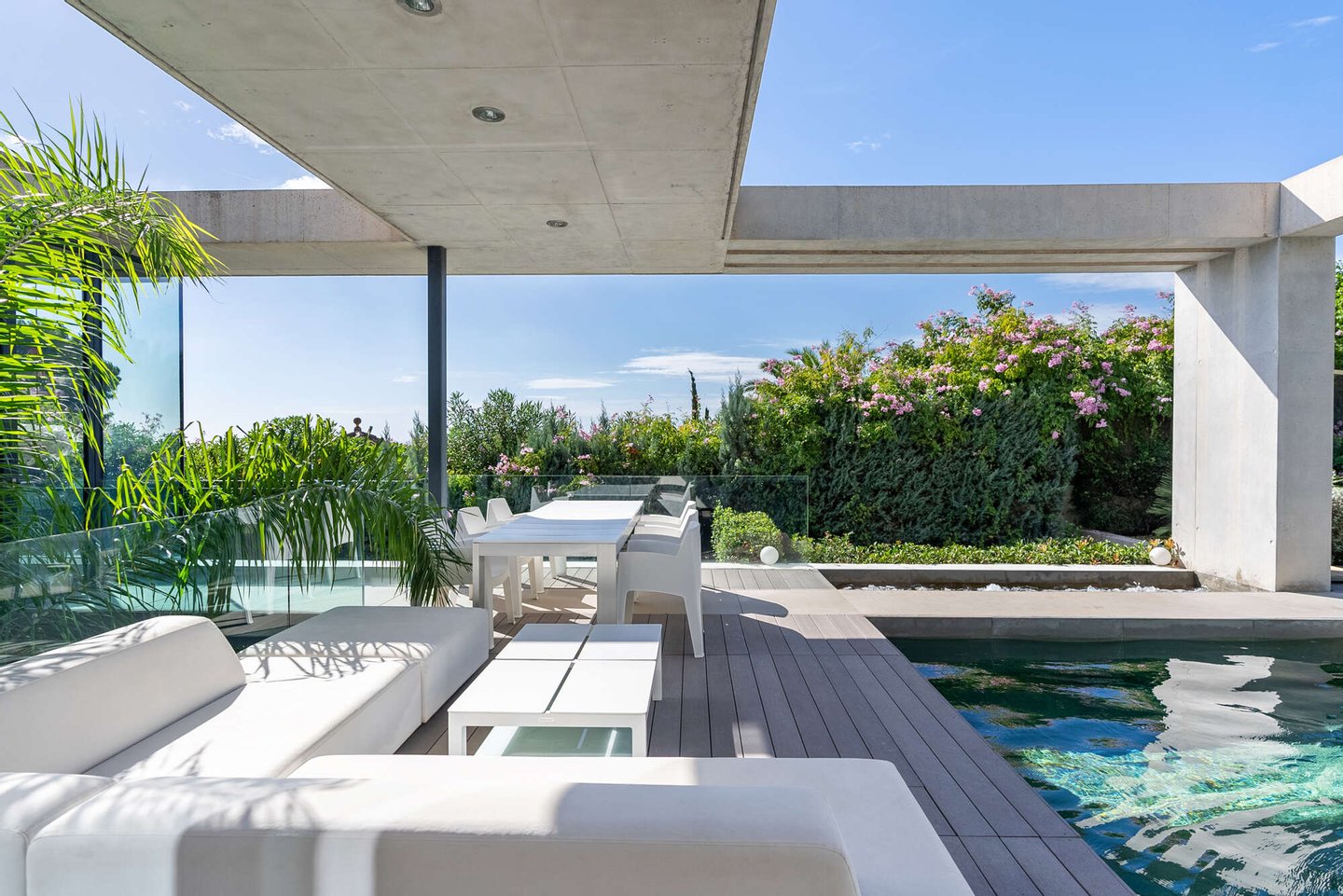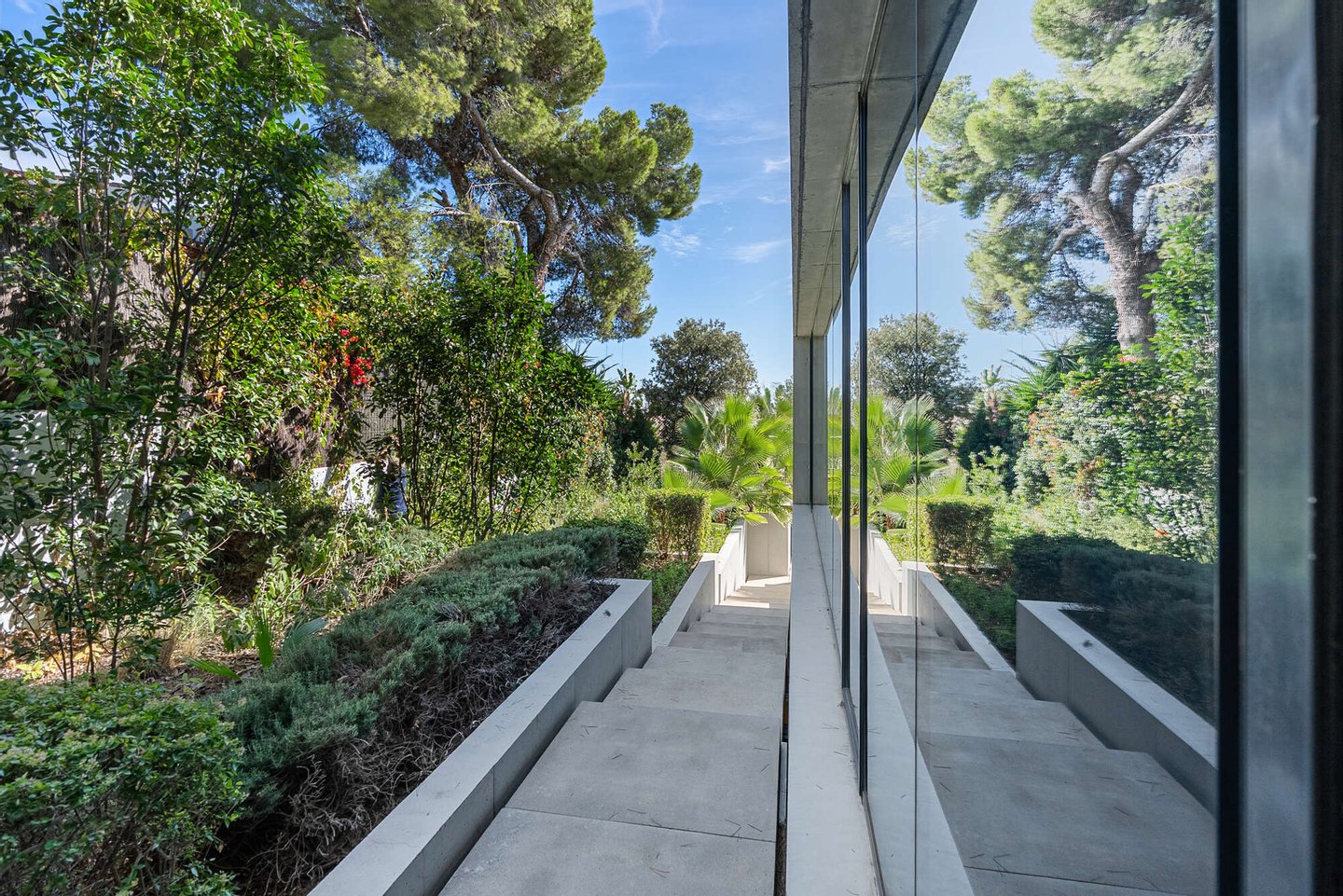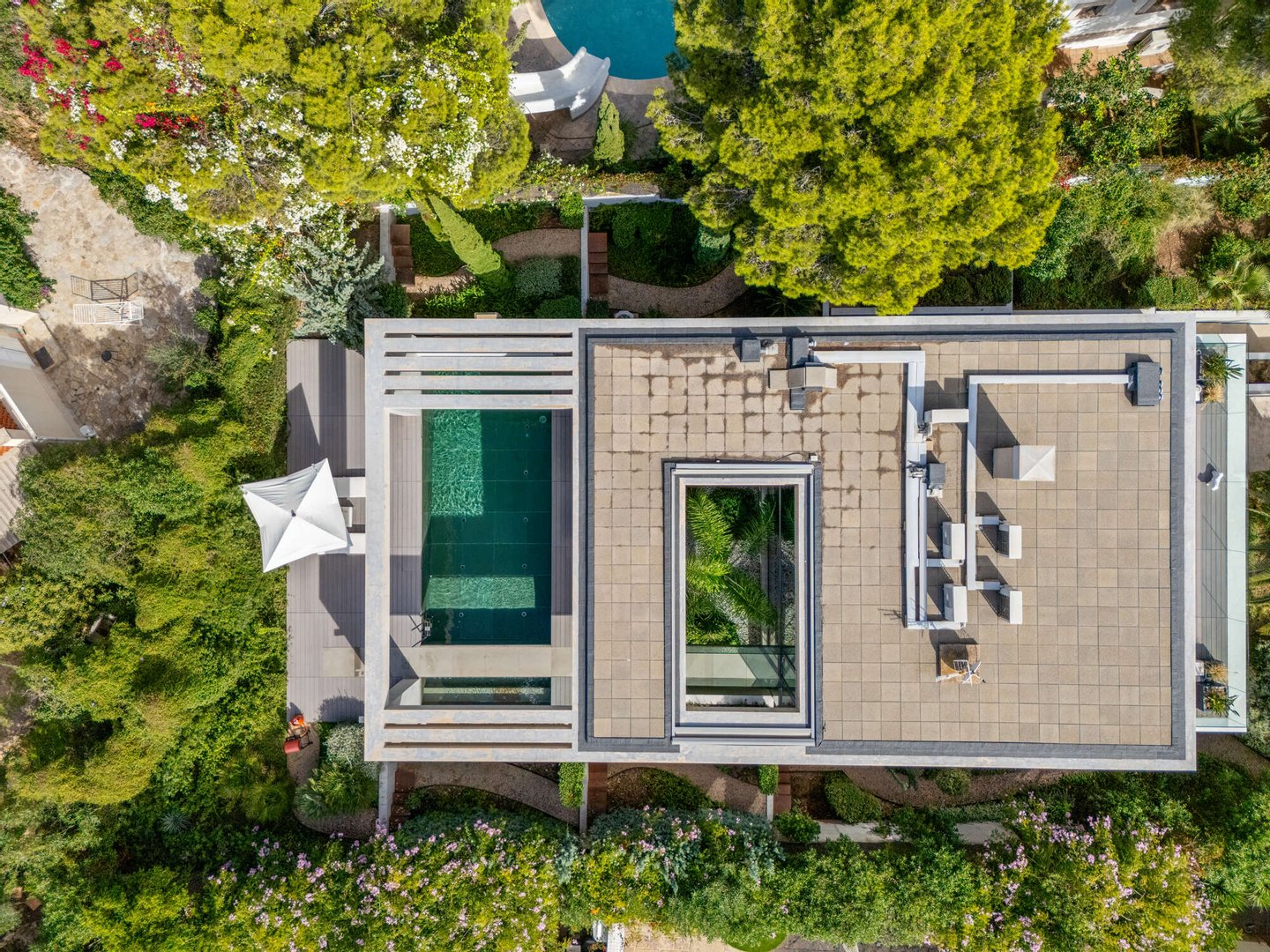 Im Freien entfaltet sich ein Lebensgefühl von mediterraner Leichtigkeit: Ein beheizbarer Pool mit Jacuzzi, weitläufige Terrassen und ein liebevoll angelegter Garten schaffen eine private Oase, in der Entspannung und Genuss mühelos ineinanderfließen. Ergänzt wird das Anwesen durch ein großzügiges Untergeschoss mit Garage für bis zu vier Fahrzeuge, weiterem Stauraum und einem zusätzlichen Badezimmer – ein diskreter Luxus, der das Gesamtbild vollendet.
