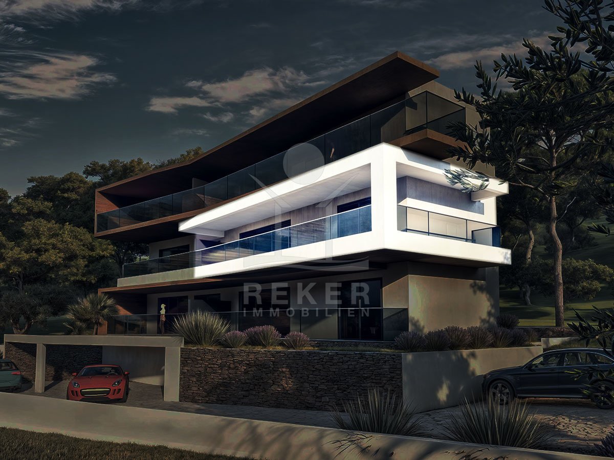In einer stillen Seitenbucht, rund 30 Meter vom Meer entfernt, entsteht ein modernes Wohngebäude mit sechs exklusiven Apartments. Klare Linien, Glas und helle Materialien bestimmen die Architektur. Das Gebäude fügt sich gut in die Landschaft ein und schafft eine ruhige, elegante Stimmung. Für jede Einheit steht ein eigener Parkplatz bereit. Die Außenflächen sind gepflegt, mit mediterranen Pflanzen und gepflasterten Wegen. Ein Ort mit viel Privatsphäre.