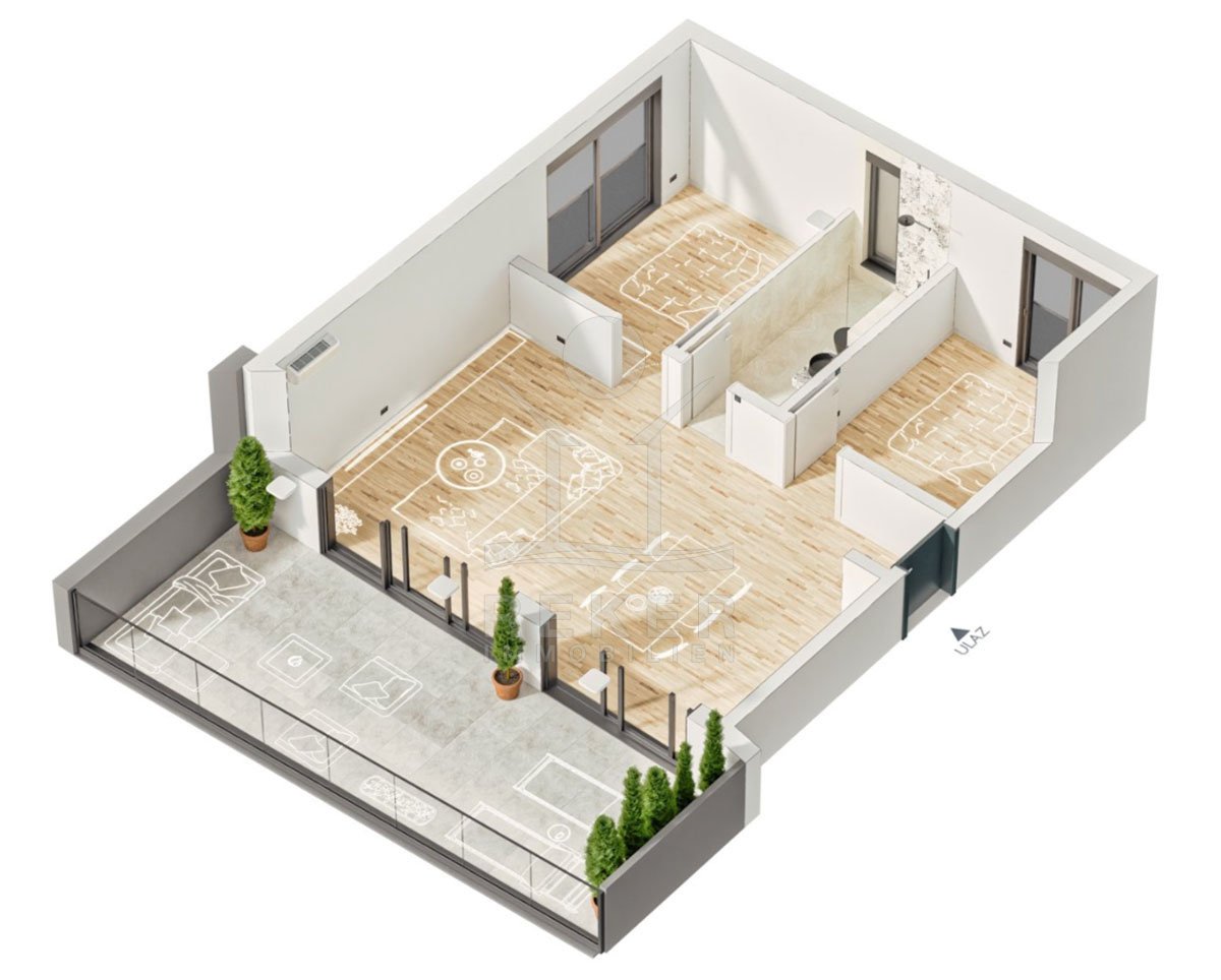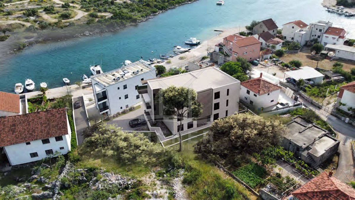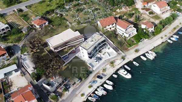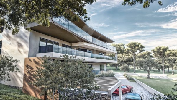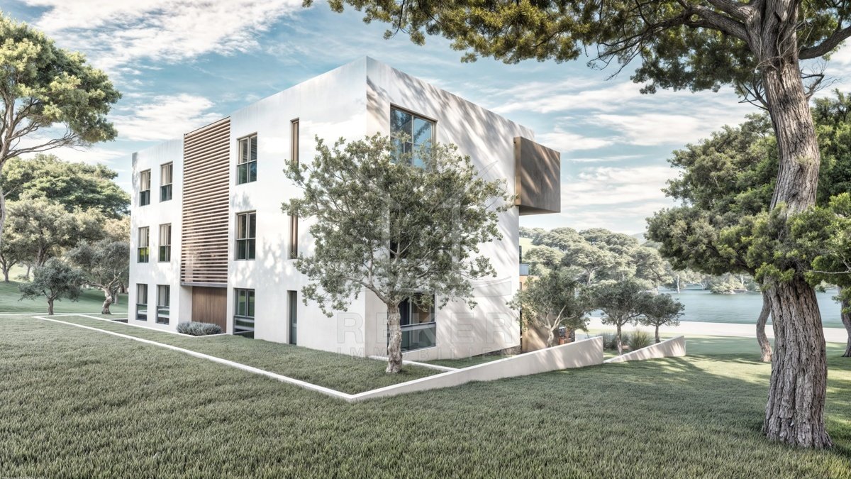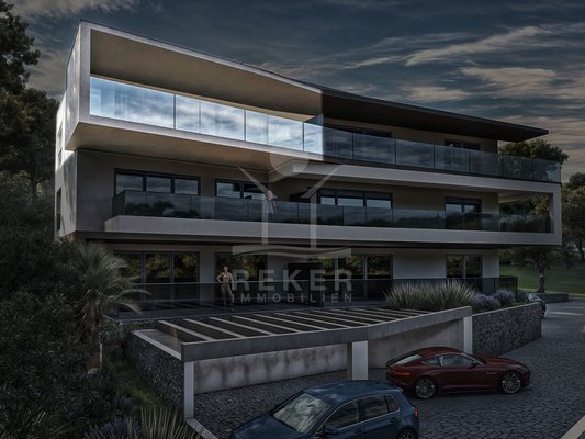 In einer stillen Seitenbucht, rund 30 Meter vom Meer entfernt, entsteht ein modernes Wohngebäude mit sechs exklusiven Apartments. Klare Linien, Glas und helle Materialien bestimmen die Architektur. Das Gebäude fügt sich gut in die Landschaft ein und schafft eine ruhige, elegante Stimmung. Für jede Einheit steht ein eigener Parkplatz bereit. Die Außenflächen sind gepflegt, mit mediterranen Pflanzen und gepflasterten Wegen. Ein Ort mit viel Privatsphäre.