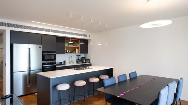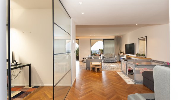 Geräumige und gestaltete 2-Zimmer-+-Bürowohnung im Andromeda-Jaffa-Komplex, mit sorgfältiger Planung, einem außergewöhnlich offenen und großzügigen öffentlichen Bereich, großzügigen Proportionen und reichlich Tageslicht. Die Wohnung verfügt über eine