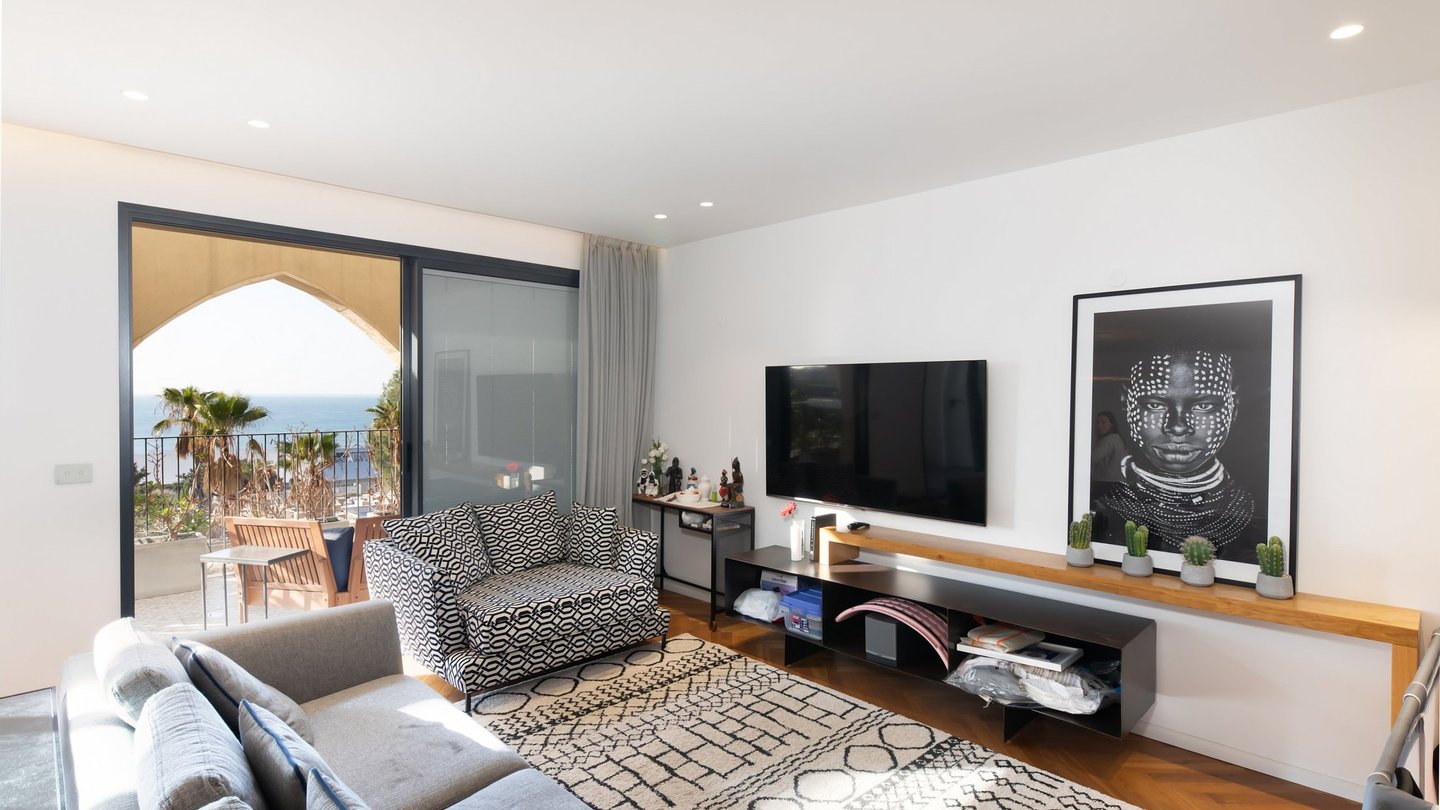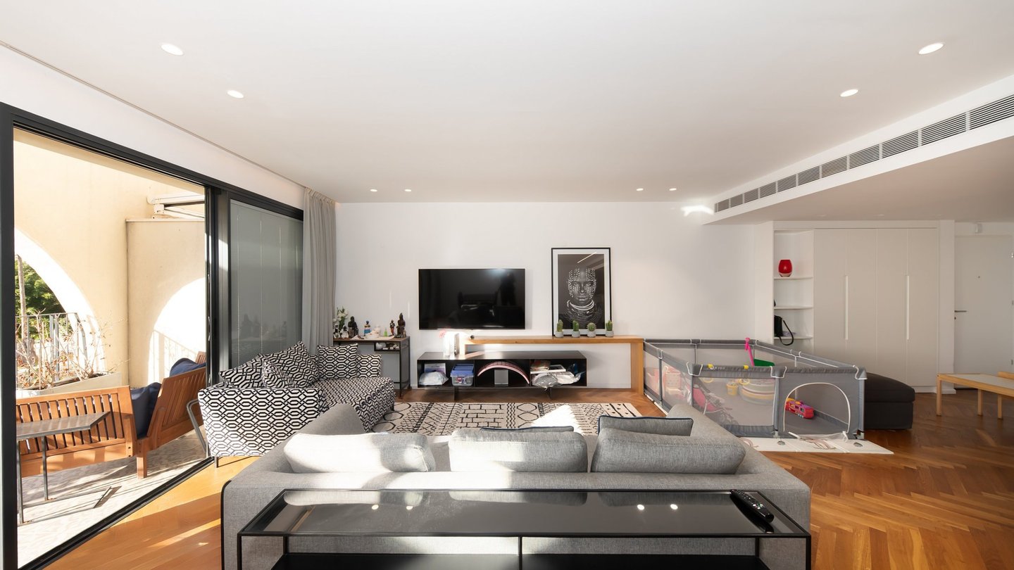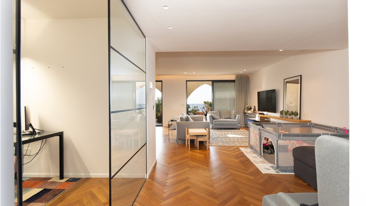 Geräumige und gestaltete 2-Zimmer-+-Bürowohnung im Andromeda-Jaffa-Komplex, mit sorgfältiger Planung, einem außergewöhnlich offenen und großzügigen öffentlichen Bereich, großzügigen Proportionen und reichlich Tageslicht. Die Wohnung verfügt über eine