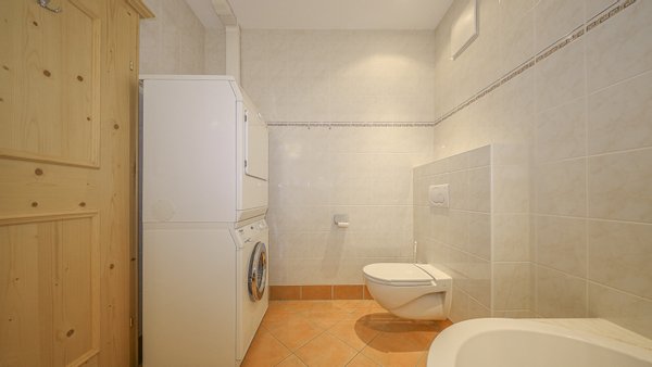 Das geschmackvolle, voll ausgestattete Badezimmer besitzt eine Badewanne, Handwaschbecken, WC und einen Waschmaschinenanschluss.