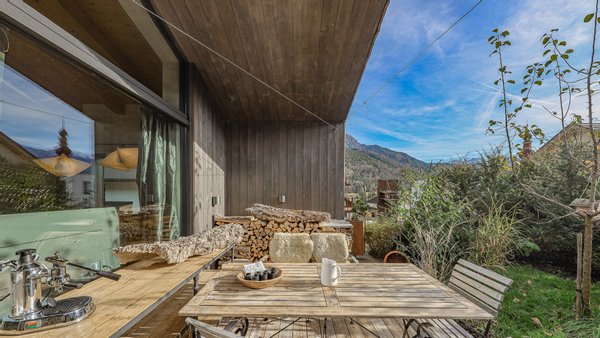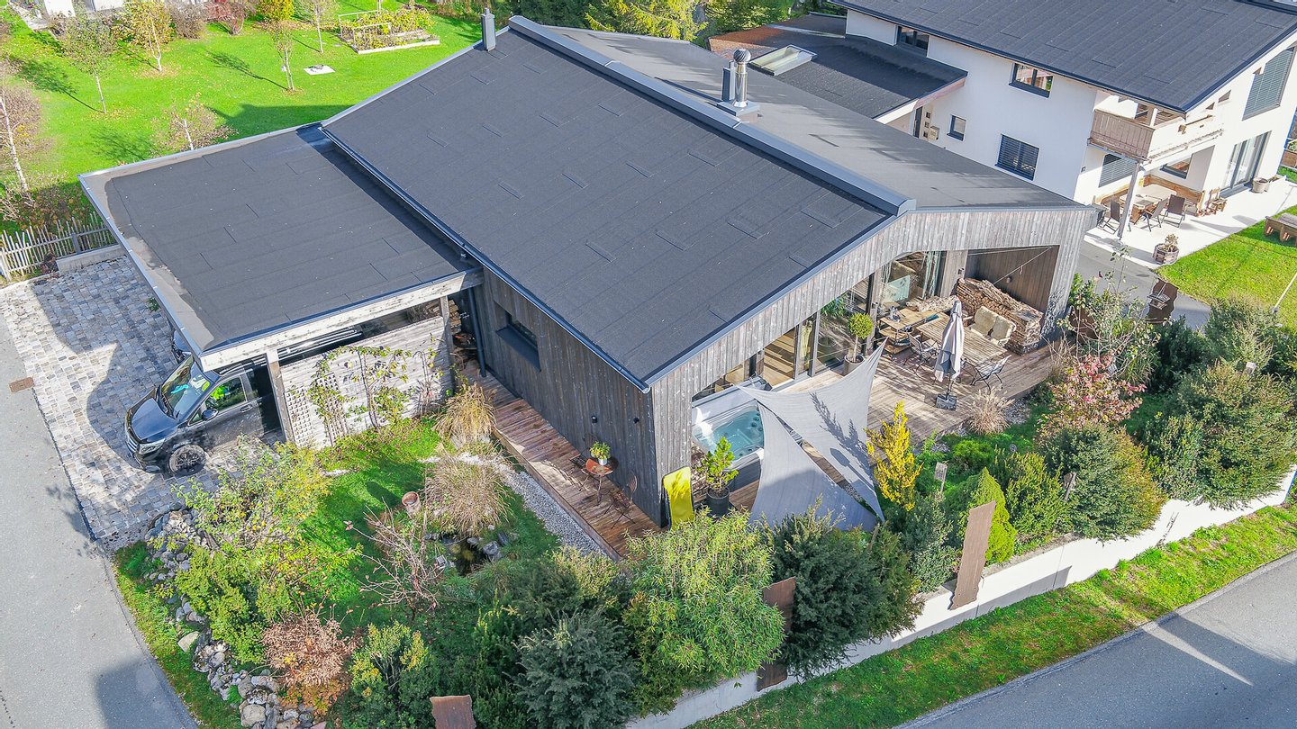 Man betritt das Haus über die Diele mit freiem Blick in den Wohn-/Essbereich und auf den aus jedem Raum in dieser Ebene sichtbaren offenen gehackten Dachstuhl. Eine fast vollständig verglaste und grossflächig zu öffnende Südfront gibt den Blick auf die grosszügig angelegte Süd Terrasse frei, die mit Loungebereich/Sitzgruppe, Feuerschale und ganzjährig beheiztem Whirlpool zum Verweilen einlädt.